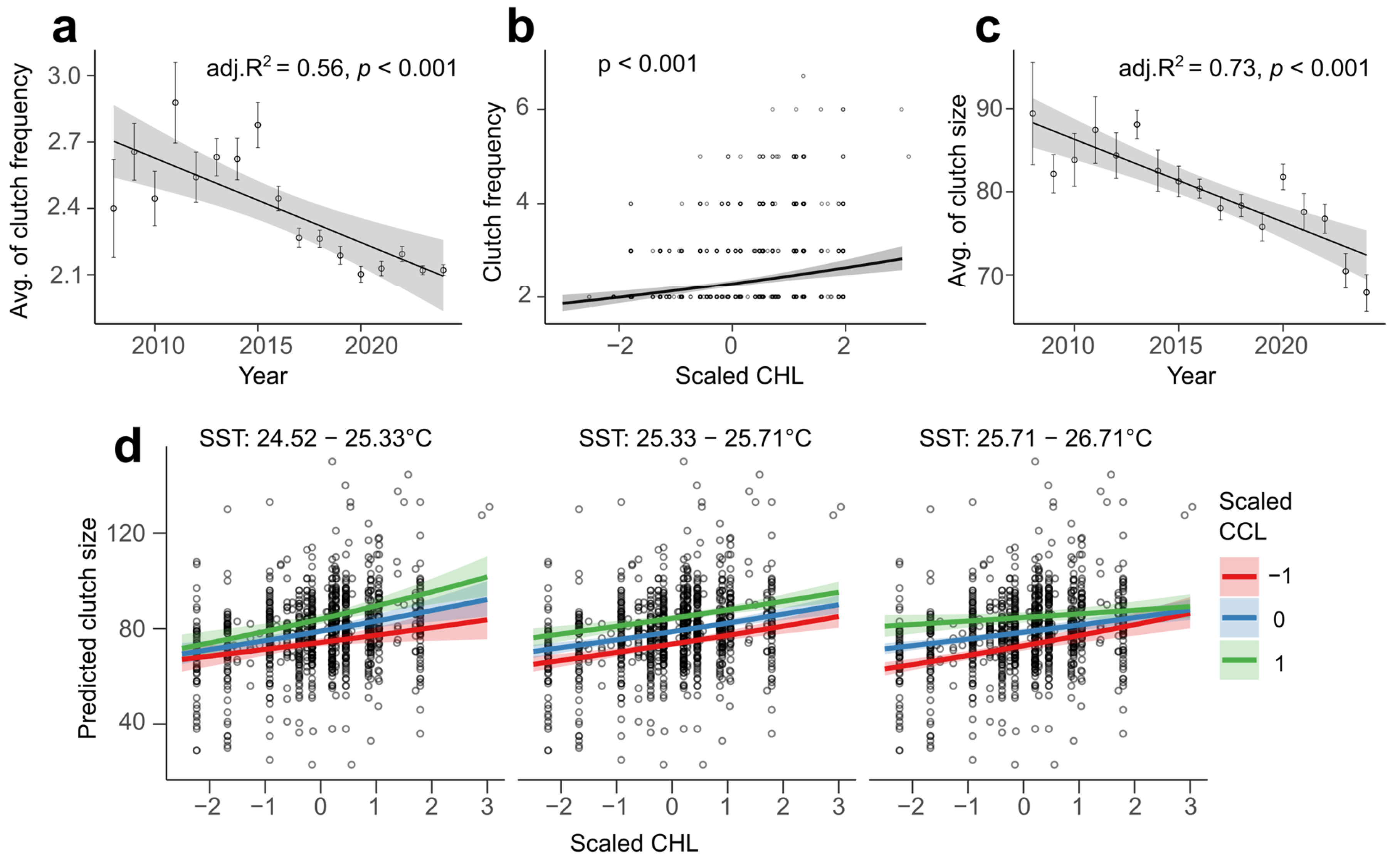 - Clutch Frequency: Clutch frequency correlates with SST at breeding grounds (June–October), CHL at foraging grounds (November–May), and body size, since both temperature and energy reserves can influence the number of clutches per season.