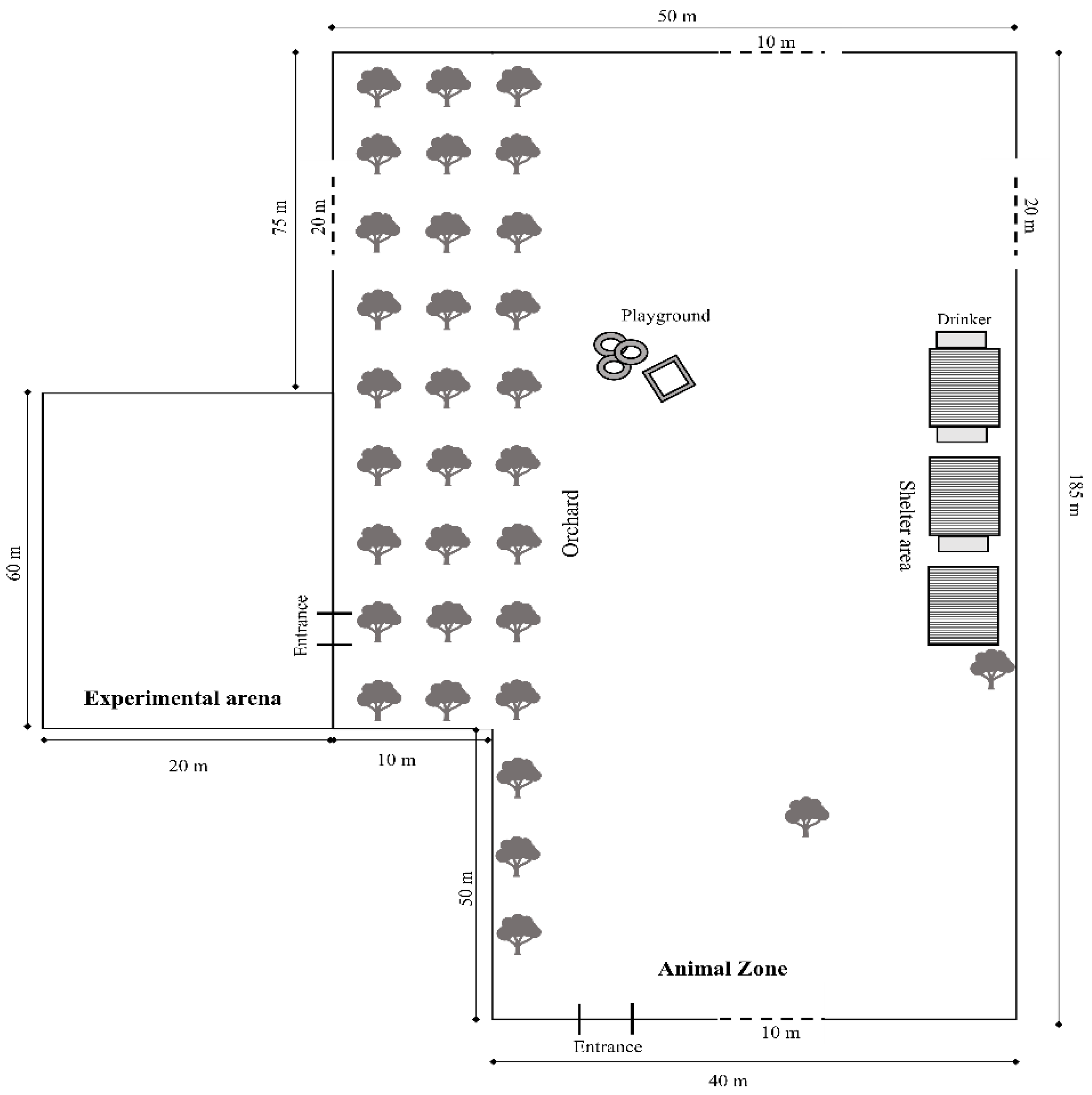 Figure 1). It covered 0.92 hectares, and a smaller pasture (0.12 hectares) was also attached to the western side of the zone and periodically made available to the animals. During the study period, it served as an experimental arena and was open to goats for at least two hours daily beyond the testing hours, so they would treat it as part of the zone and behave naturally.