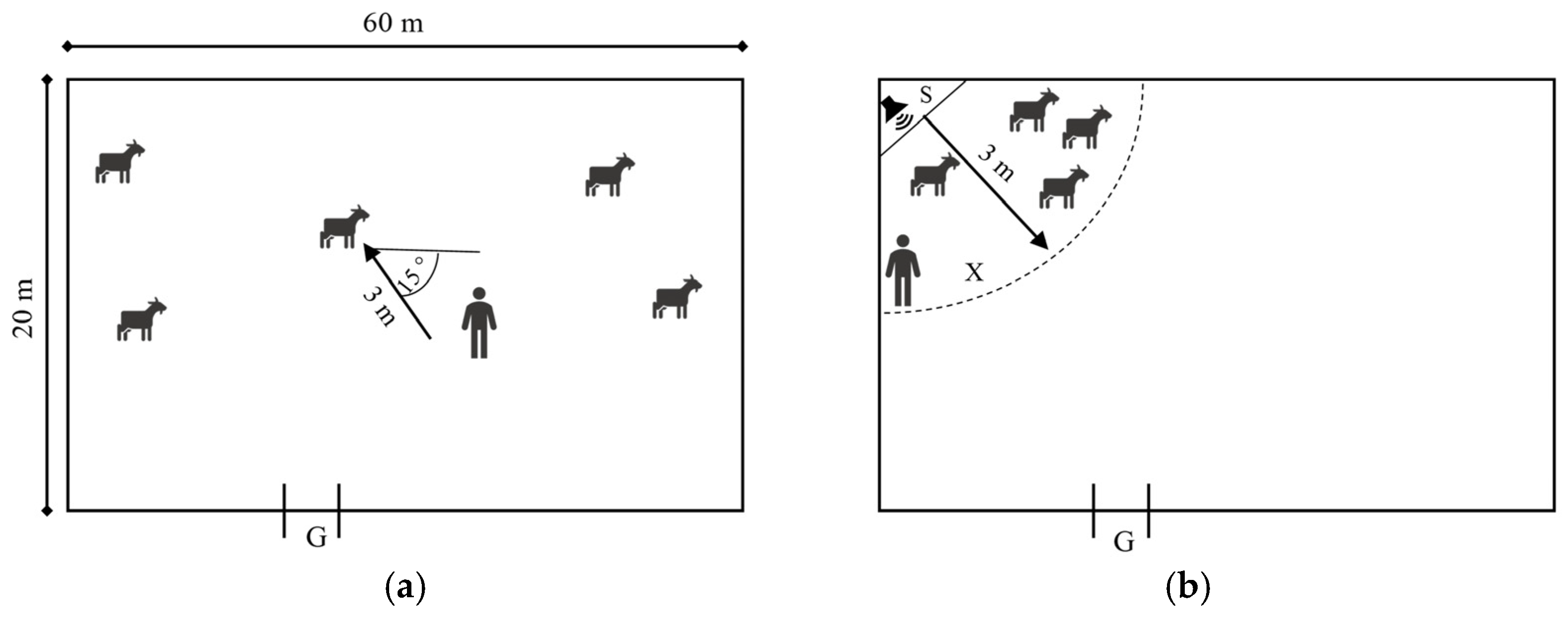 Figure 2b). The animals were allowed to enter the experimental arena three days before the tests to habituate to it. In the corner of the quarter circle, a concealed loudspeaker was placed behind a partition in such a way that the distance from the partition to the edge of the circle was three metres. One minute before the test, goat-favoured pellets were scattered within the marked area (feeding area) to ensure that all individuals entered its boundaries. A 10 s recording of an unfamiliar sound at 50 dB was then played, and the goats’ reactions were recorded for two minutes. In the control trial, the goats remained alone in the feeding arena (test F), whereas in the experimental trial, an NP sat on a low seat within the feeding area near the edge of the quarter circle (test H). The person behaved as during the passive human test. To minimise the risk of habituation, two sounds played in a randomised order were used: (1) a noise resembling radio interference with clicks and crackles, and (2) applause. The control and experimental trials were conducted once a day, with at least one hour between trials, in random order, for five consecutive days. For each goat, the time spent in the designated area [s], the occurrence or absence of fleeing after the sound playback (1–0 method [