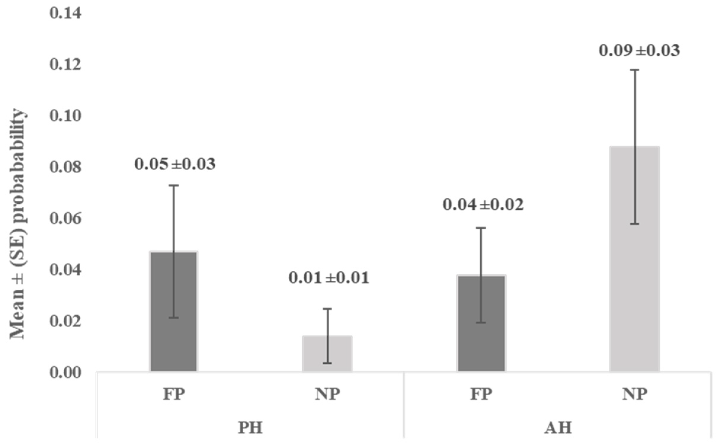 Unlike in the Human Approach Test, the goats in the present study rarely approached a human voluntarily in both the passive human test (PH) and active human test (AH). For a feeding person, the probability of successful trials was 0.05 and 0.04, respectively, and for a neutral person, 0.01 and 0.09, respectively. Hence, although the lack of intensive human socialisation alongside standard handling procedures generally mitigates fear in the presence of humans, as shown in the Human Approach Test, it remains insufficient to promote the animals’ willingness and motivation to engage in voluntary interactions with humans. Early life exposure to humans results in goats that are gentler, calmer, and more comfortable in the presence of people than goats with little or no human contact [
