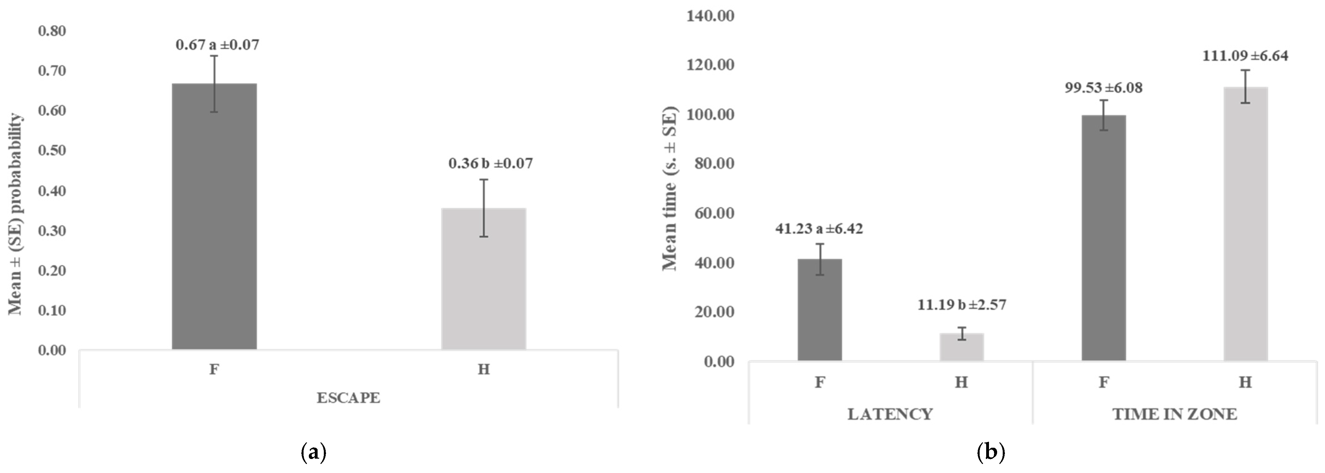 Sex was a significant factor only for certain traits: voluntary approach to passive human (PH), acceptance of human approach (HAT_A), and touch (HAT_T). Therefore, in the remaining cases, the effect of sex was not discussed in the results. The order of repetition was not a significant factor. Continuous data were presented as means ± SE, and differences were considered statistically significant at p < 0.05.