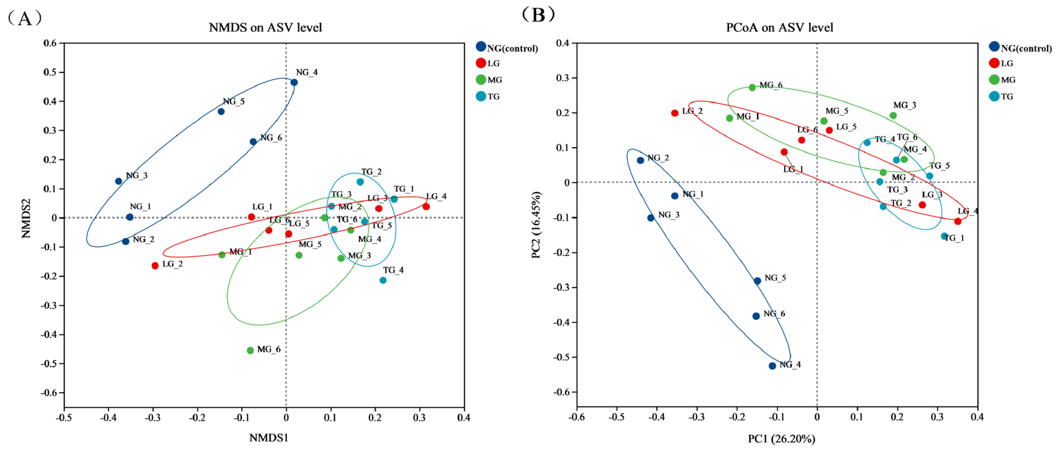 4.4. Effects of Different Sand Thickness on the Intestinal Bacteria