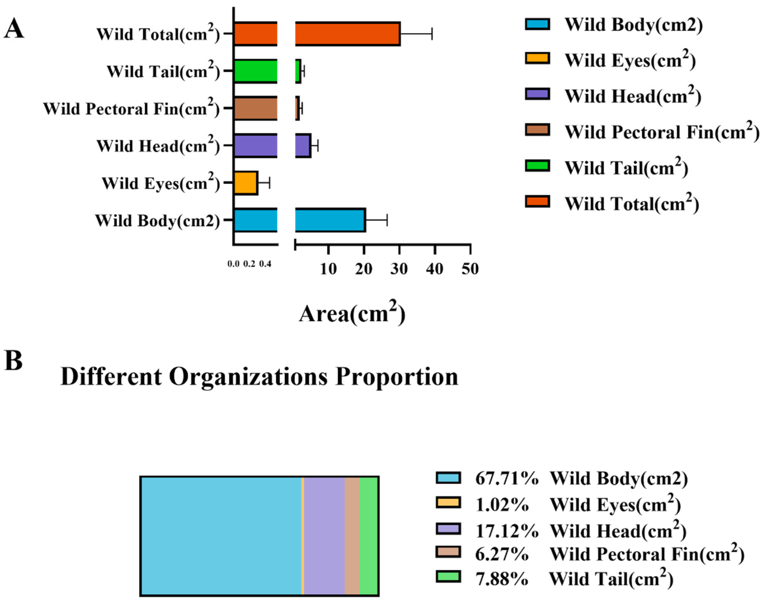 | Body Part | Farmed Average Area (cm2) | Farmed Proportion (%) | Wild Average Area (cm2) | Wild Proportion (%) | Difference Trend |