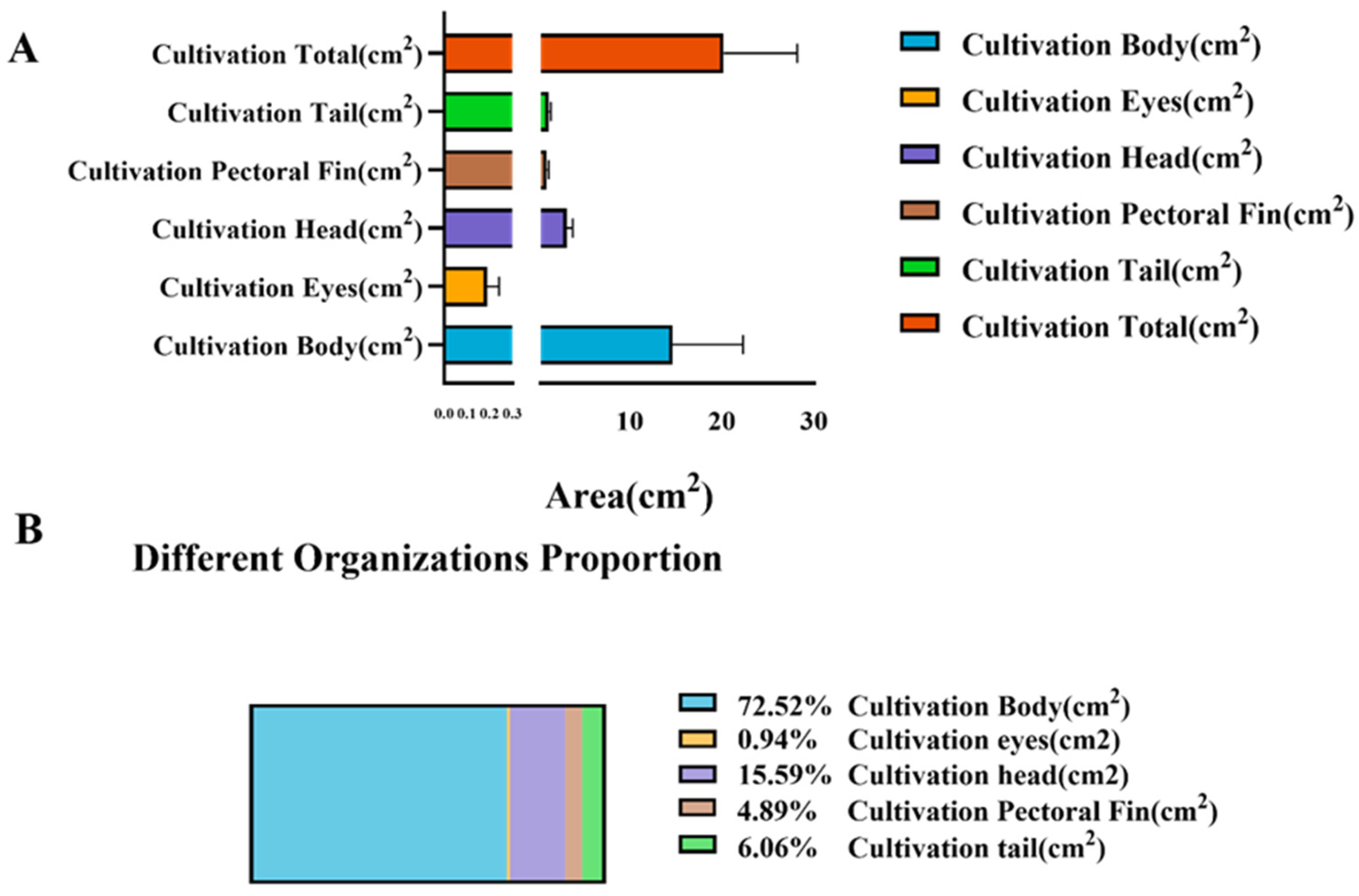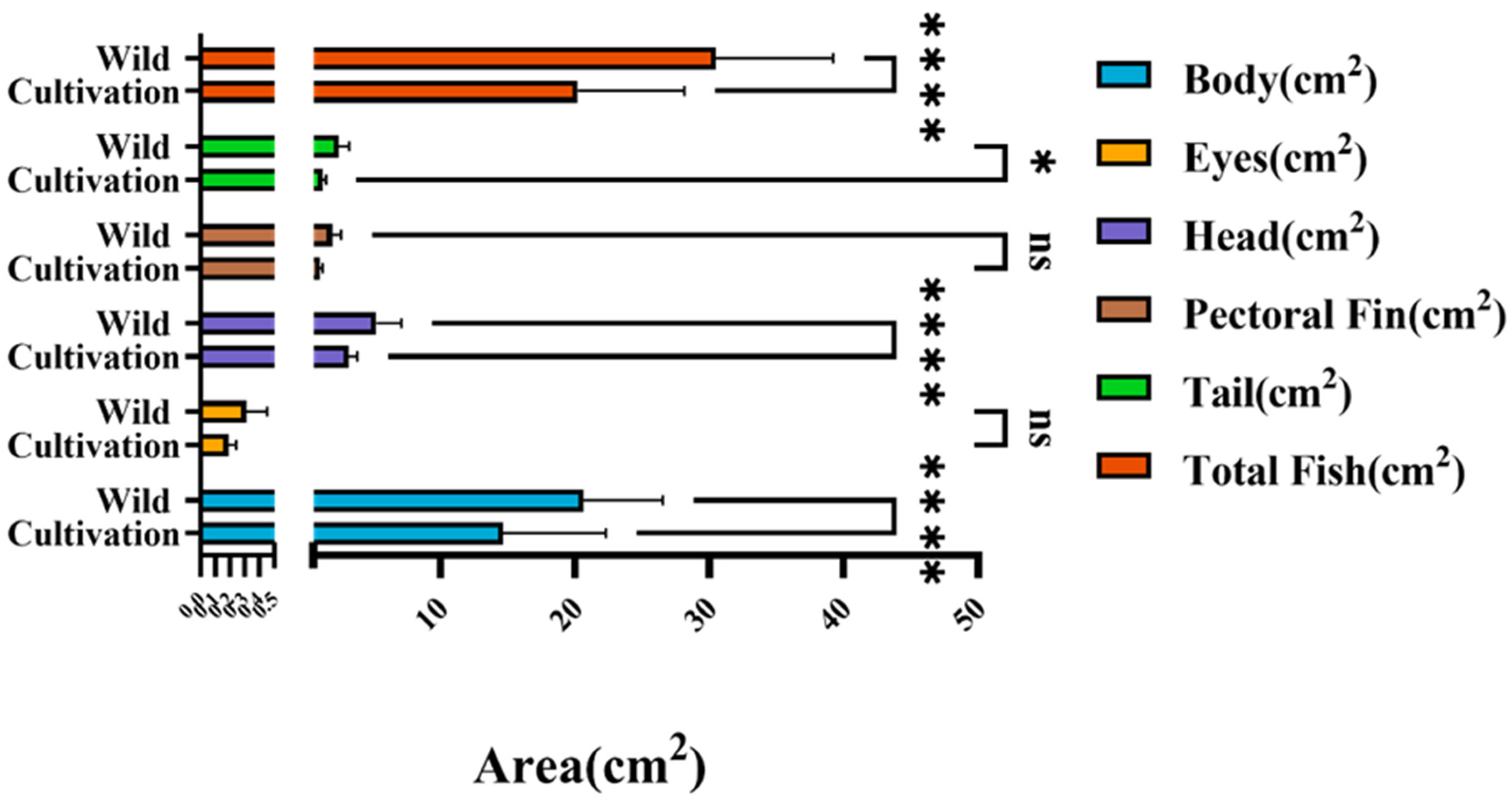 | Group | Body (cm2) | Eyes (cm2) | Head (cm2) | Pectoral Fin (cm2) | Tail (cm2) | Total (cm2) |