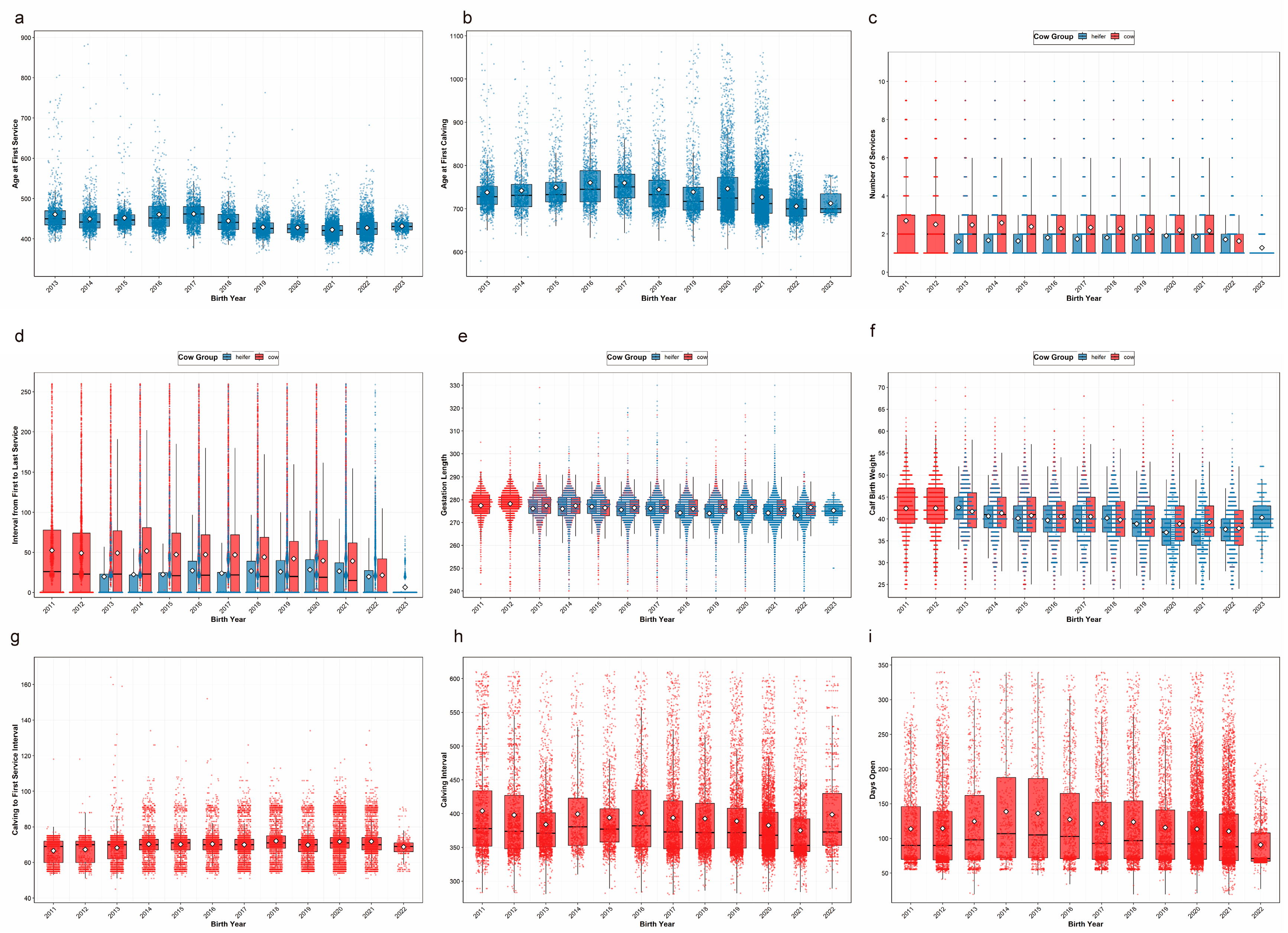 - Ayele Lombebo, W.; Kang, H.; Mingxin, D.; Tesema Wondie, Z.; Mekuriaw Tarekegn, G.; Zheng, H. Genetic parameter estimates and genetic trends for reproductive traits of Holstein dairy cattle in China. J. Dairy Sci. 2025, 109, 1775–1783. [Google Scholar] [CrossRef]