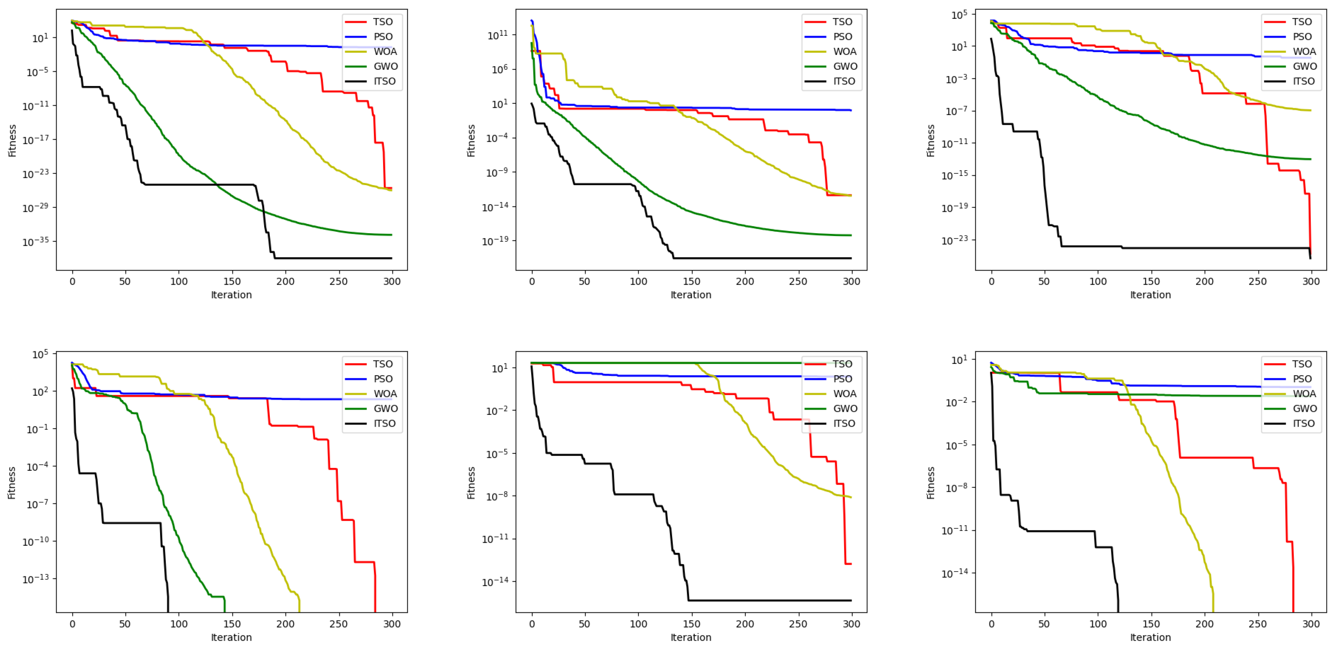 To evaluate the optimization performance of the Improved Tuna School Optimization (ITSO) algorithm, this study conducted a comparative analysis against several swarm intelligence optimization algorithms, including Particle Swarm Optimization (PSO), Grey Wolf Optimization (GWO) [