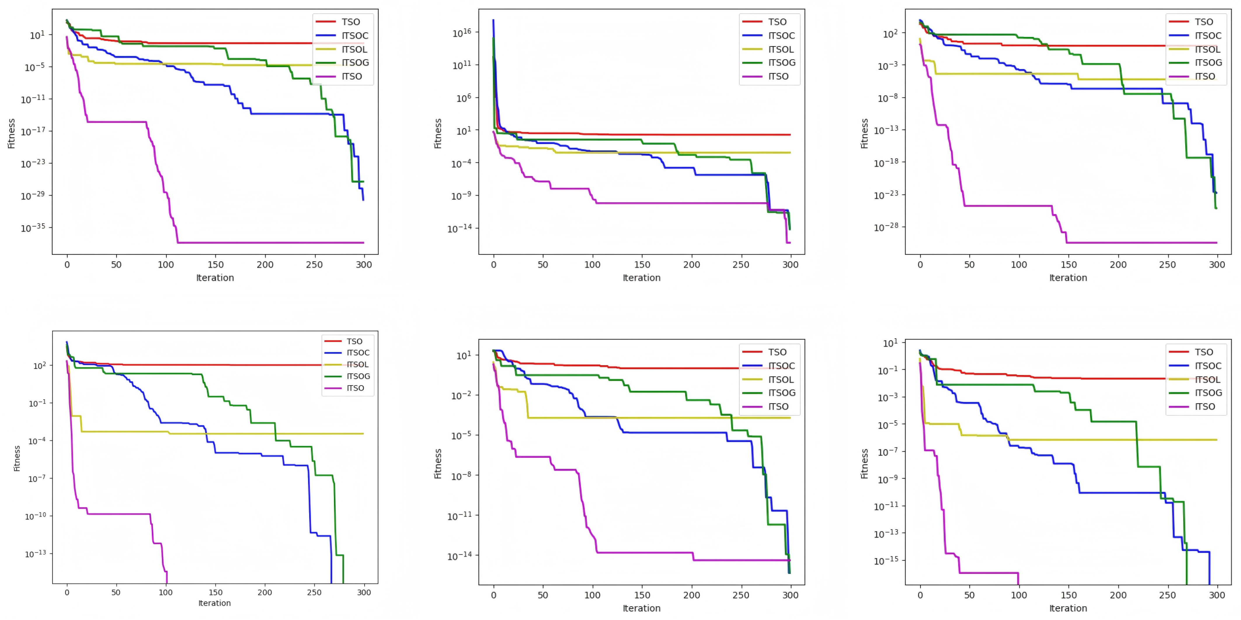 When all three strategies are integrated, the ITSO algorithm demonstrates further improvements in overall performance across all benchmark functions, achieving faster convergence speed and higher final solution accuracy. This indicates that ITSO possesses stronger global exploration capability in the early stage and enhanced local exploitation ability in the later stage.