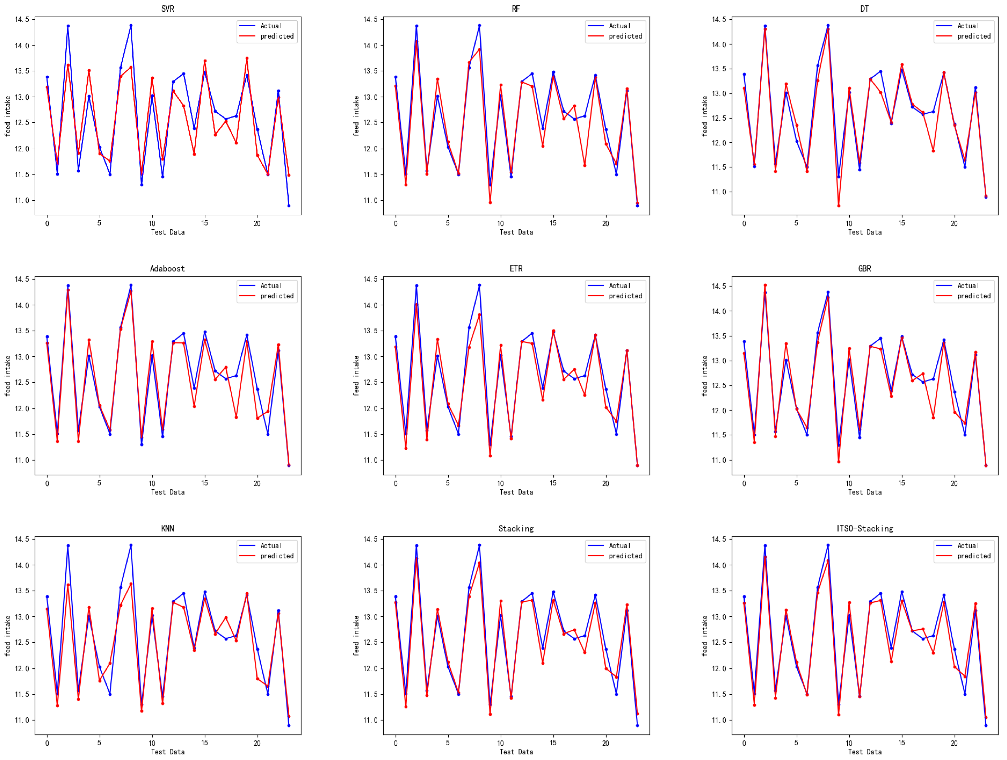 To validate the accuracy of the dry matter intake assessment model proposed in this study, we developed four groups of comparative models. The first group comprises classical machine learning models, including Decision Tree (DT), Random Forest (RF) and Support Vector Regression (SVR). The second group contains independent model algorithms, such as Gradient Boosting Regressor (GBR), Extra Trees Regressor (ETR), Adaptive Boosting (AdaBoost), and K-Nearest Neighbors (KNN). The third group features a Stacking ensemble model, while the fourth group includes the ITSO-optimized Stacking ensemble model. The first three groups are primarily used for comparison with the ITSO-optimized Stacking ensemble model.
