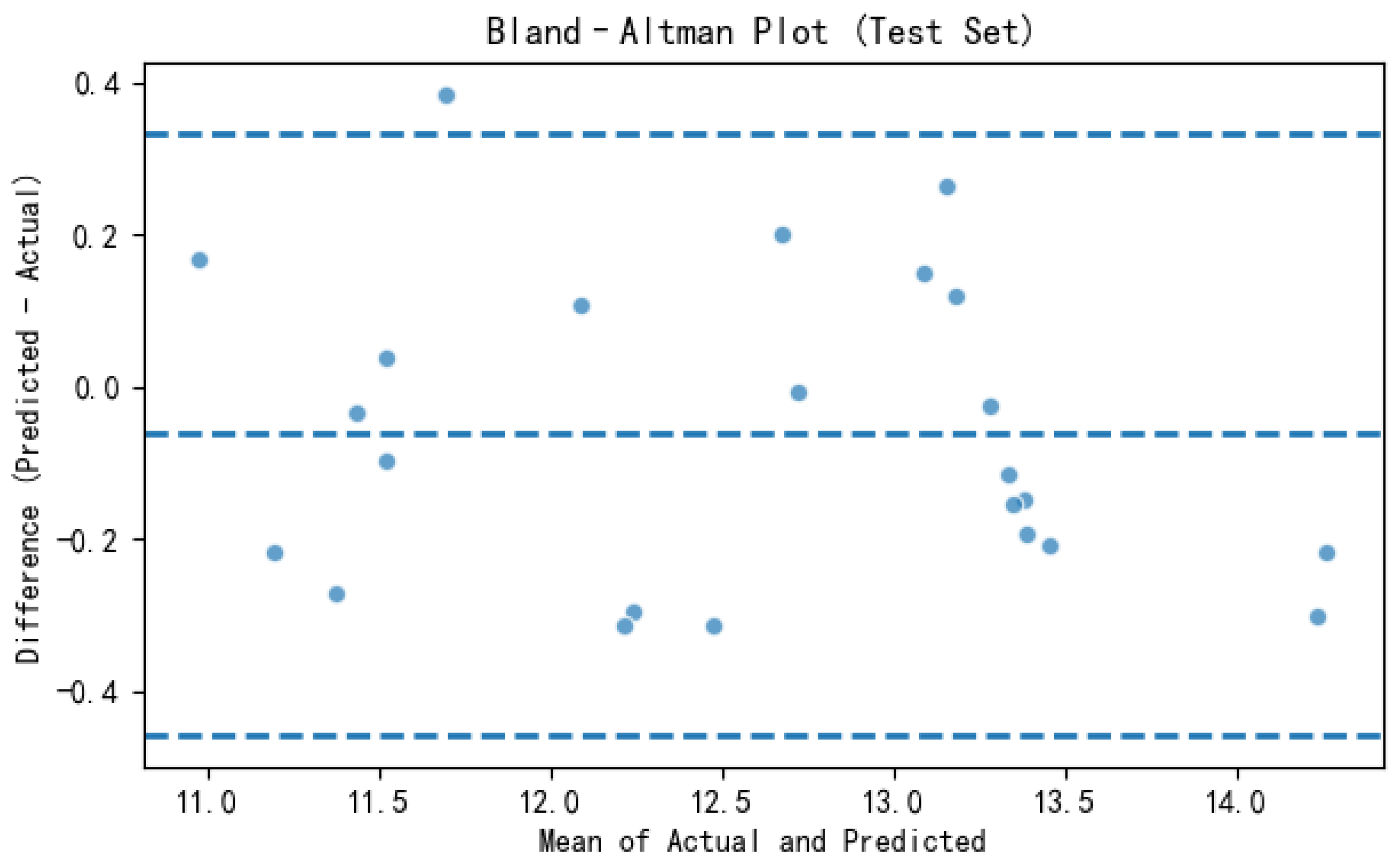 To further examine the agreement between the predicted dry matter intake and the measured values, a Bland–Altman analysis was conducted on the test set for the ITSO-optimized Stacking ensemble model. The Bland–Altman plot is shown in