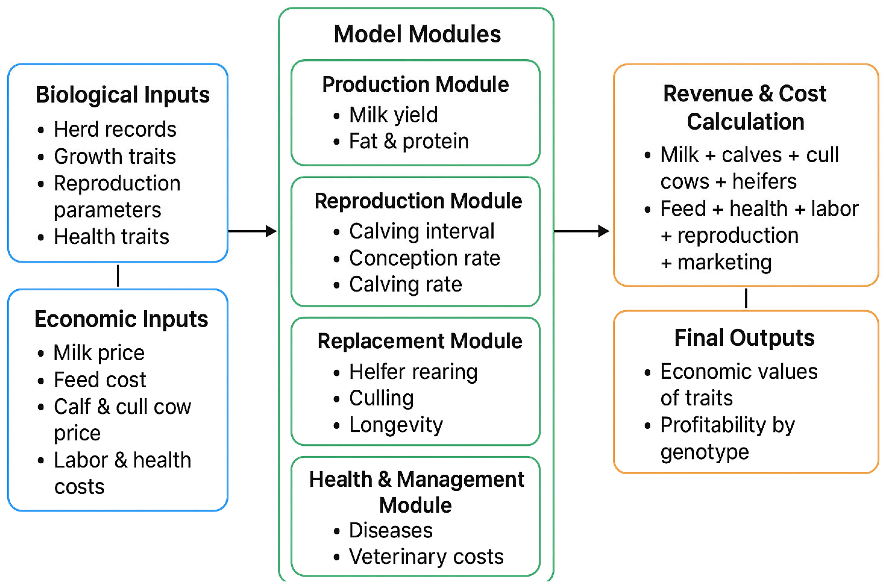 The model integrates biological and economic components of a dairy herd and allows the estimation of profitability for different genotypes. The model structure includes interrelated subsystems representing production performance, reproductive processes, replacement heifer management, herd health, male calf production and sales, and overall management and operational costs. The biological and economic variables incorporated into the model were directly derived from the herd records (