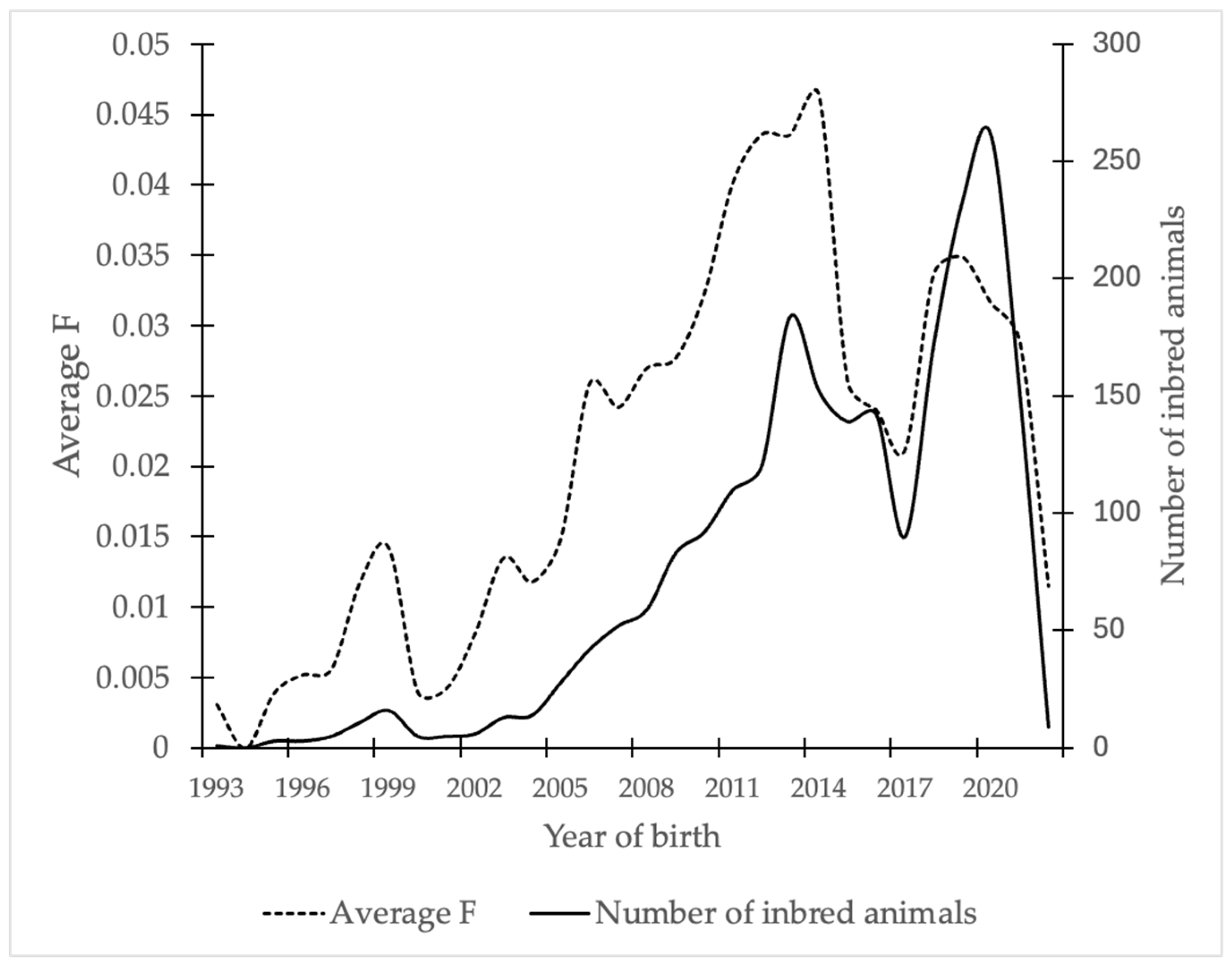 - Baumung, R.; Farkas, J.; Boichard, D.; Mészáros, G.; Sölkner, J.; Curik, I. Grain: A Computer Program to Calculate Ancestral and Partial Inbreeding Coefficients Using a Gene Dropping Approach. J. Anim. Breed. Genet. 2015, 132, 100–108. [Google Scholar] [CrossRef]