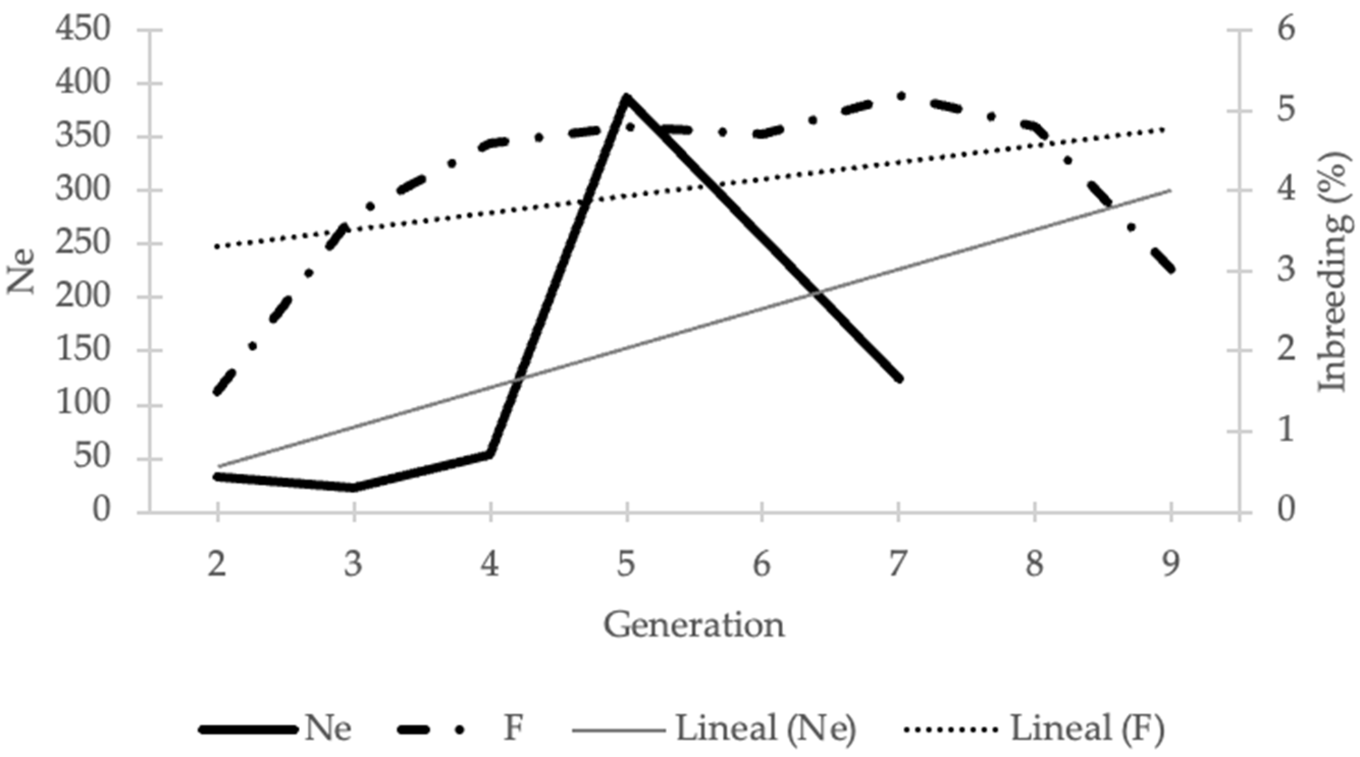 | Generation 1 | No. Animals | F % | Inbred Animals % (F %) | AR % | Ne |