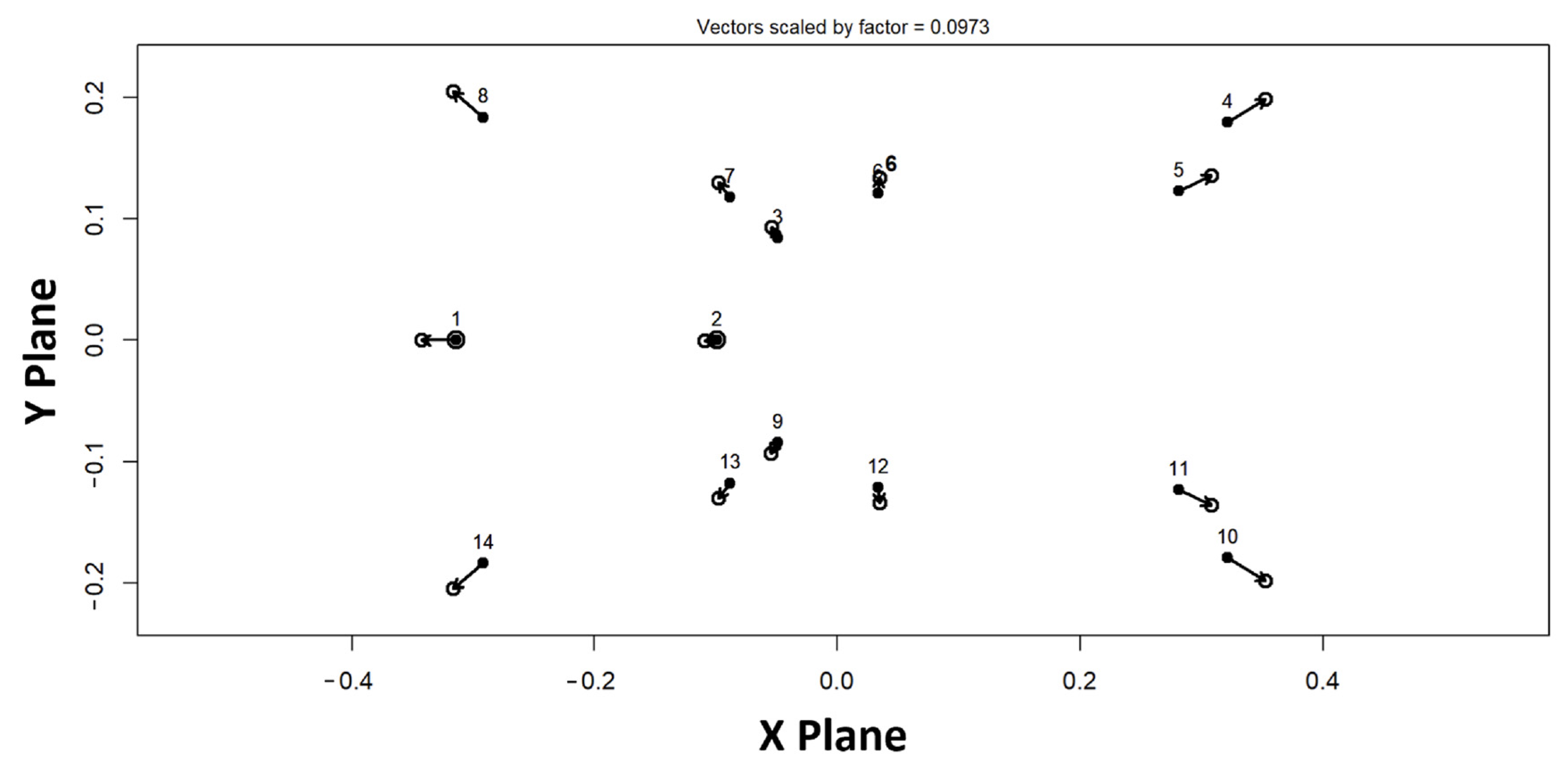 Figure 2). In this plot, vectors represent the direction and relative magnitude of systematic left–right shape differences at each landmark, shown as displacements from the symmetric mean configuration. Consistent with the significant DA term in the Procrustes ANOVA, the DA vectors indicate a structured, non-random pattern of directional deviation across the landmark configuration (