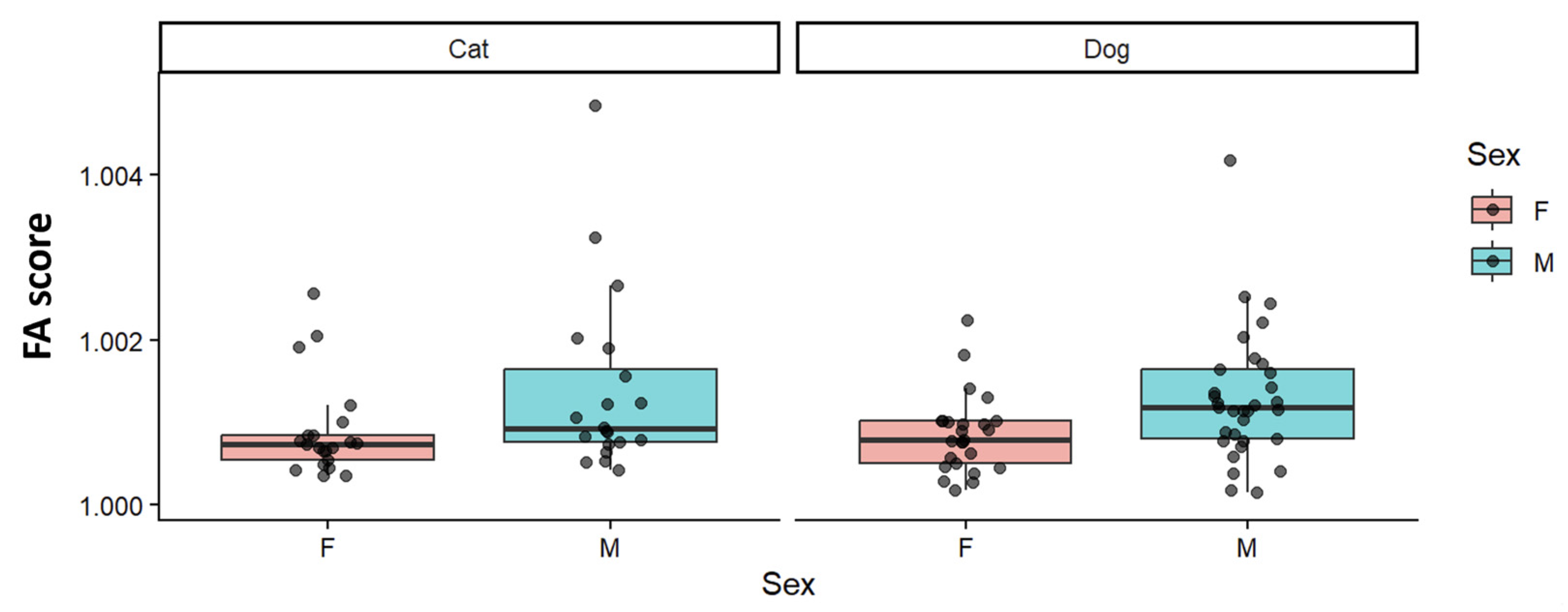 Figure 3). The boxplots and individual data points show the spread and central tendency of signed DA scores for females and males in cats and dogs. Across groups, the distributions partially overlap, while differences in the location and dispersion of the signed DA scores between sexes can be assessed visually within each species (