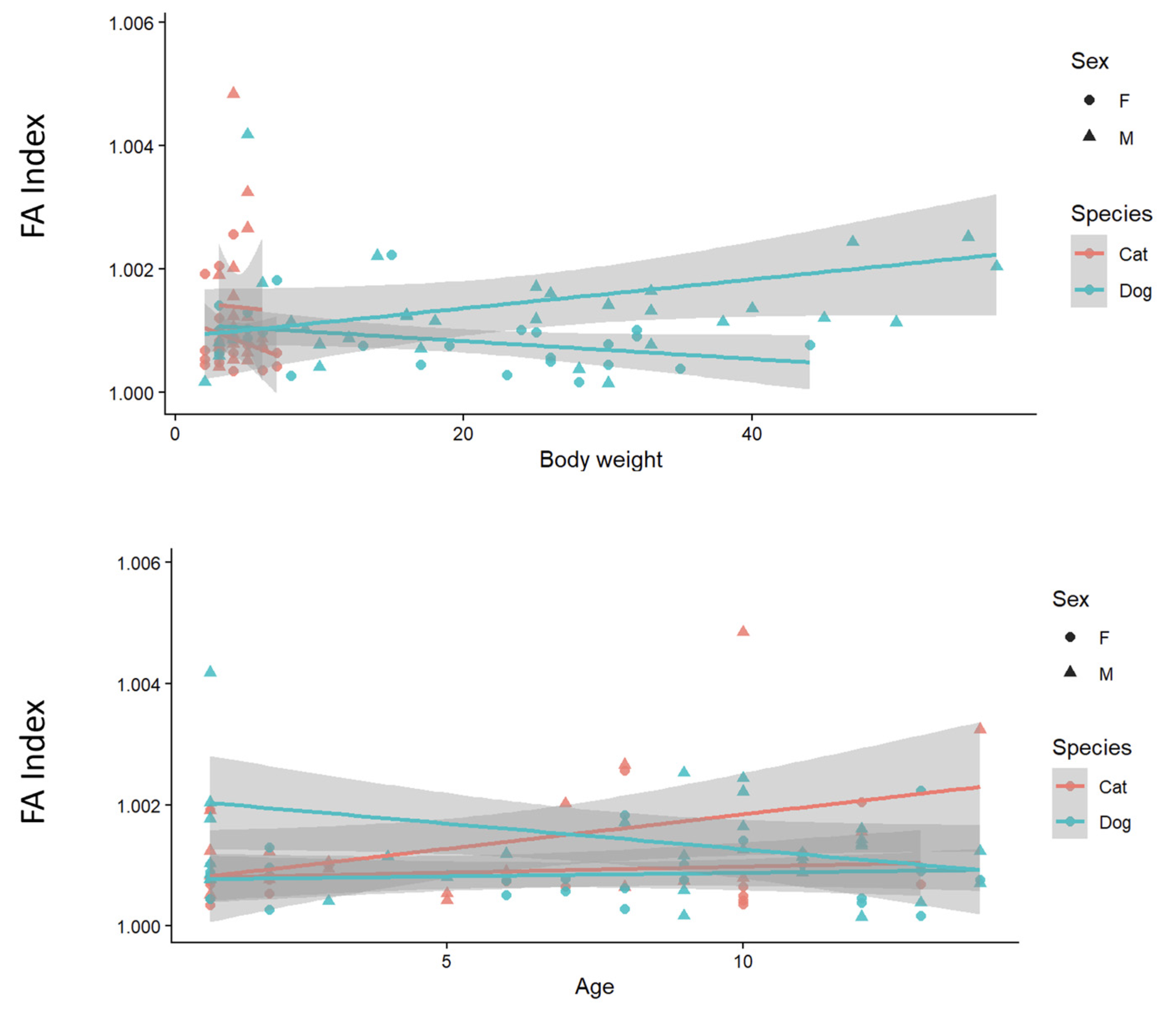 Figure 5). Across the sampled range, FA values showed only limited variation with both predictors, and the fitted trends were generally weak. Any apparent patterns differed slightly between cats and dogs, but overall changes in FA across body mass and age were modest (
