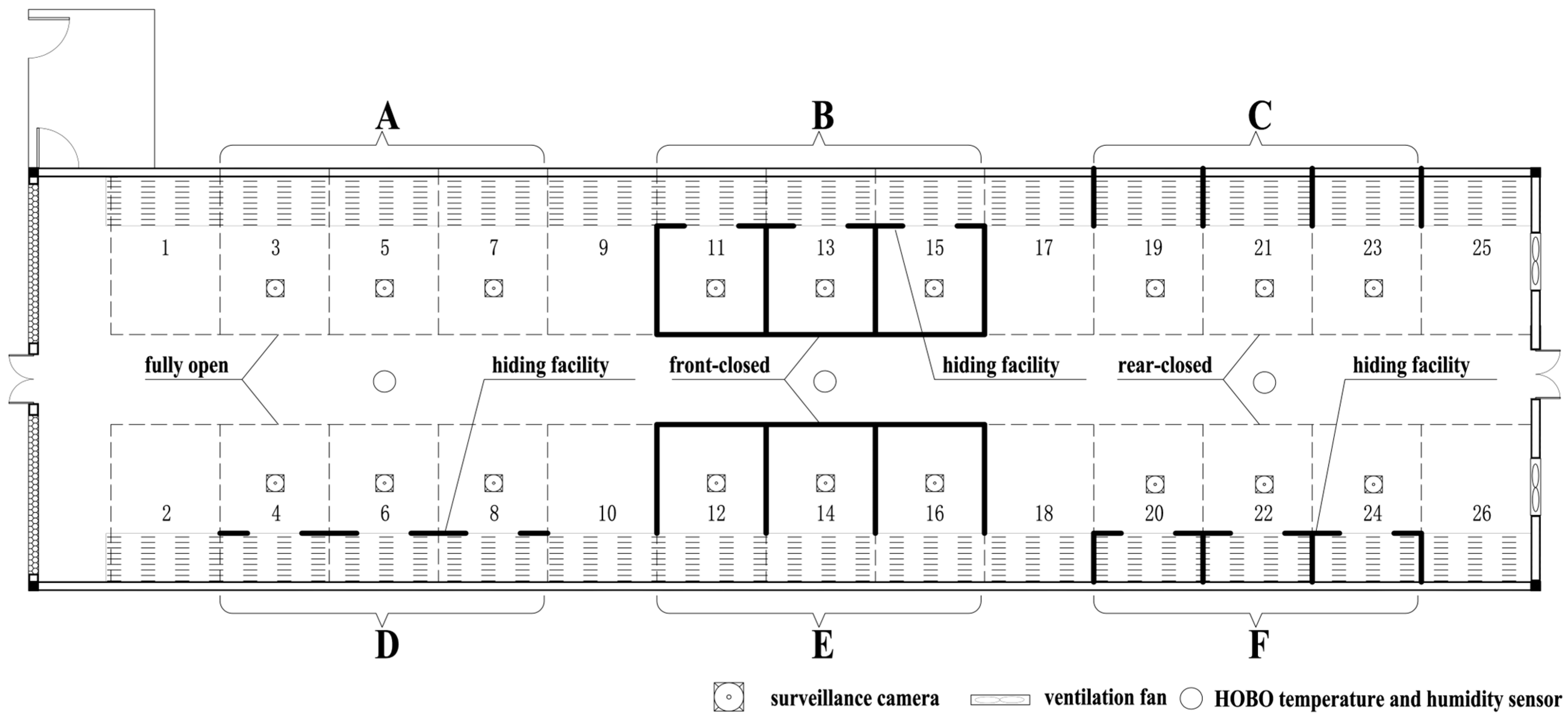 A 3 × 2 factorial design was employed, consisting of three partition types and two hiding facility conditions (Groups A–F), with three replicate pens per treatment.