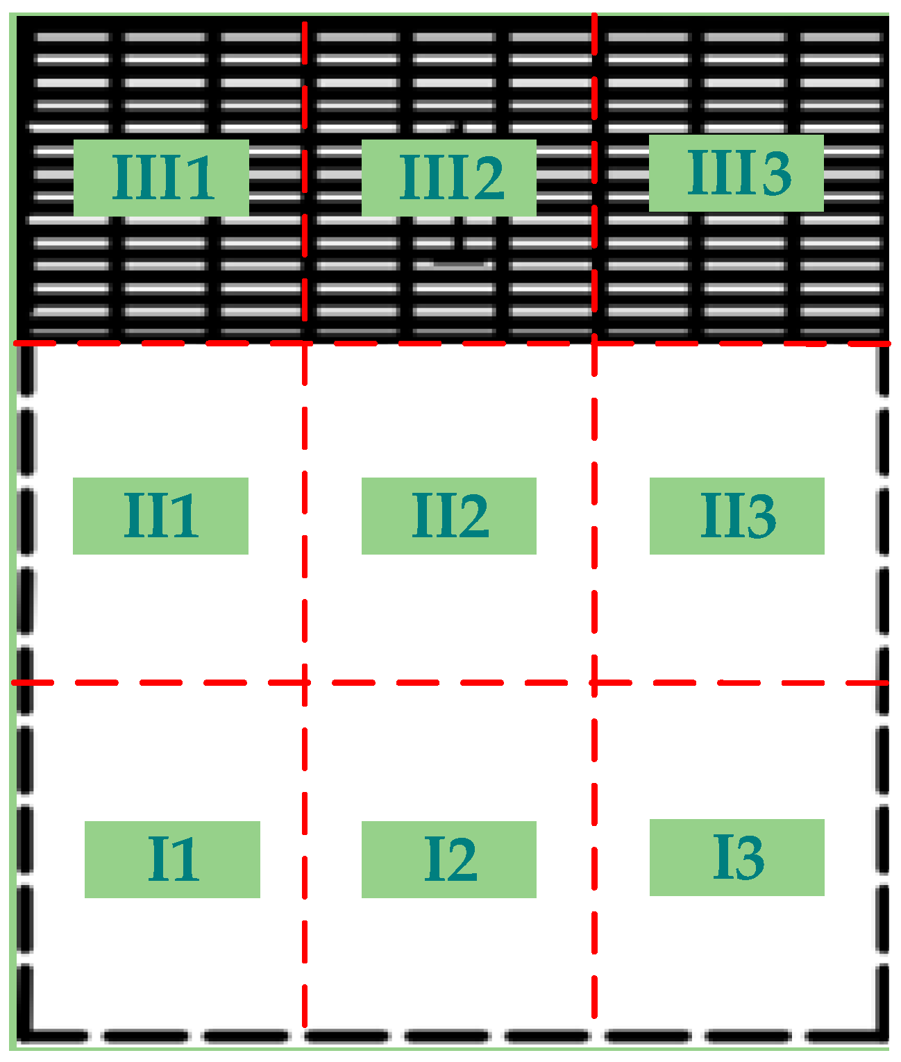 The solid-floor corner area refers to zones I1 and I3, and the central intermediate area refers to zones II1 and II3.