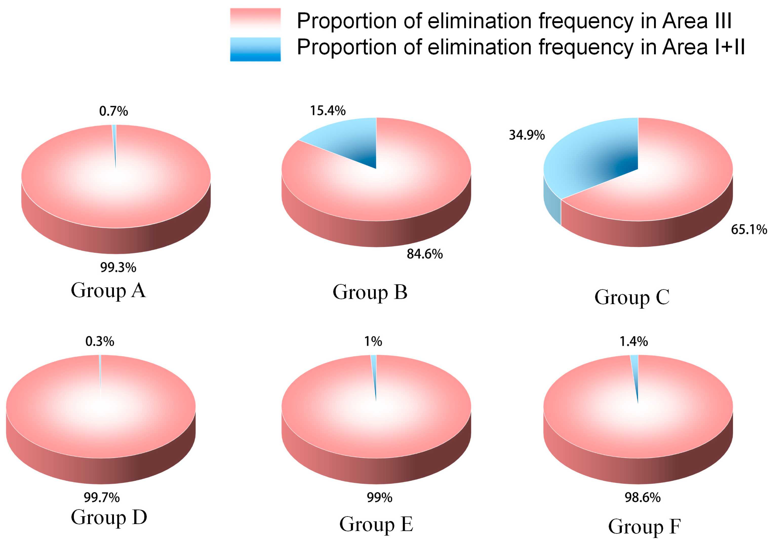 No significant differences were observed among groups for elimination in Zones I1 + I3 (p > 0.05). However, descriptively, Group B showed markedly higher values than other groups, while elimination in this area was nearly absent in the remaining treatments.