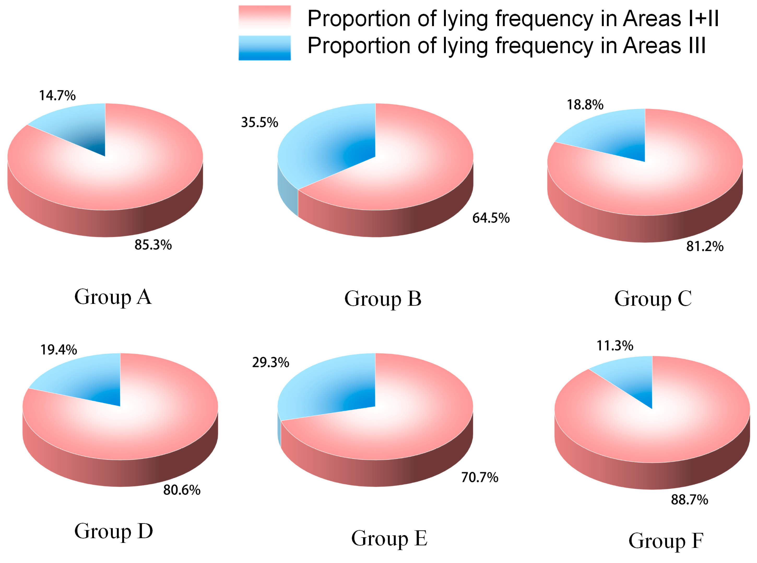 The present results indicate that although the proportion of different lying postures did not differ significantly among pen groups, the spatial distribution of lying behavior varied markedly. This suggests that pen structure primarily regulates spatial selection of lying areas rather than altering the occurrence type of lying behavior.