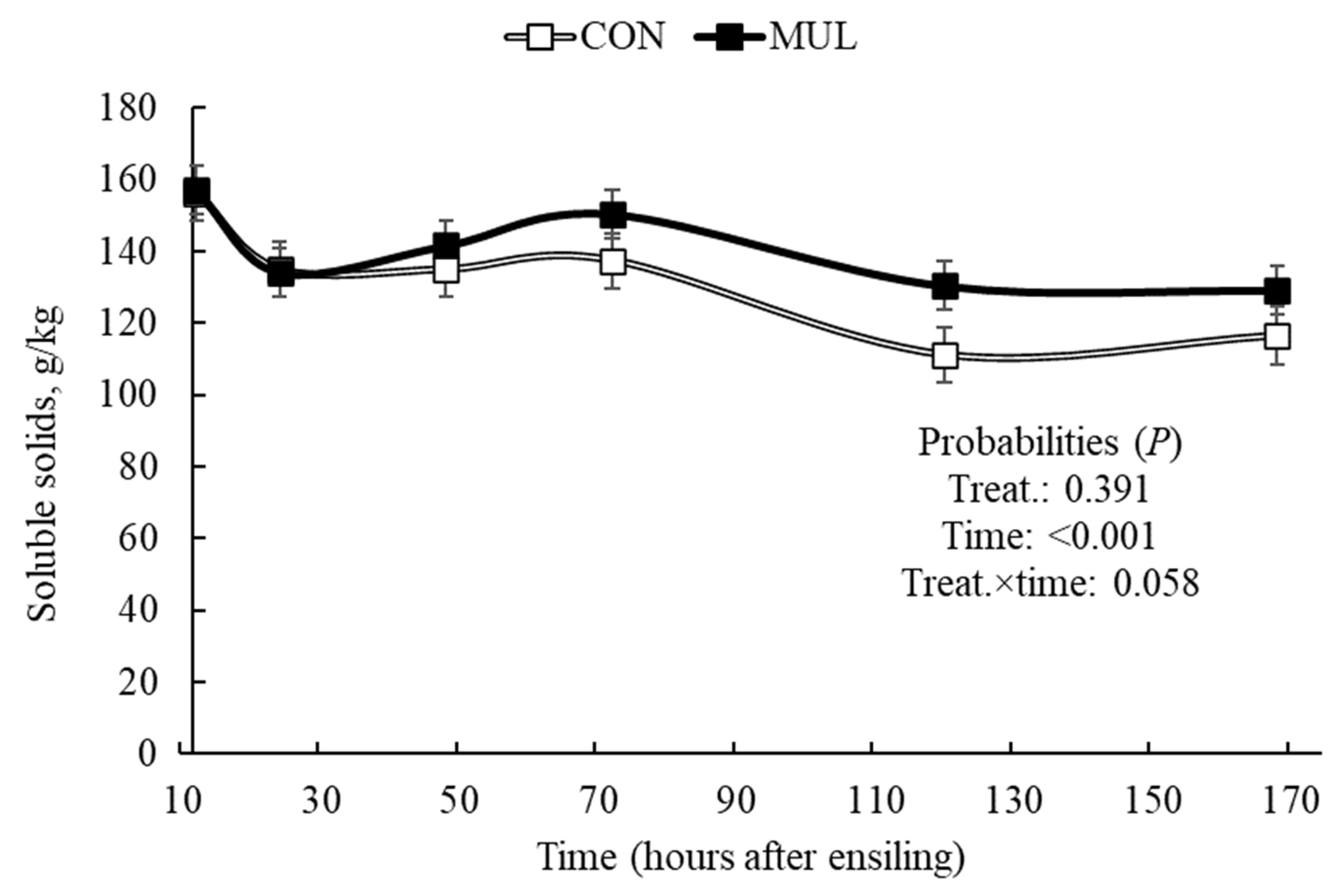 | Lactic acid, g/kg DM | 51.3 ± 4.00 | 49.0 ± 3.68 | 0.685 |