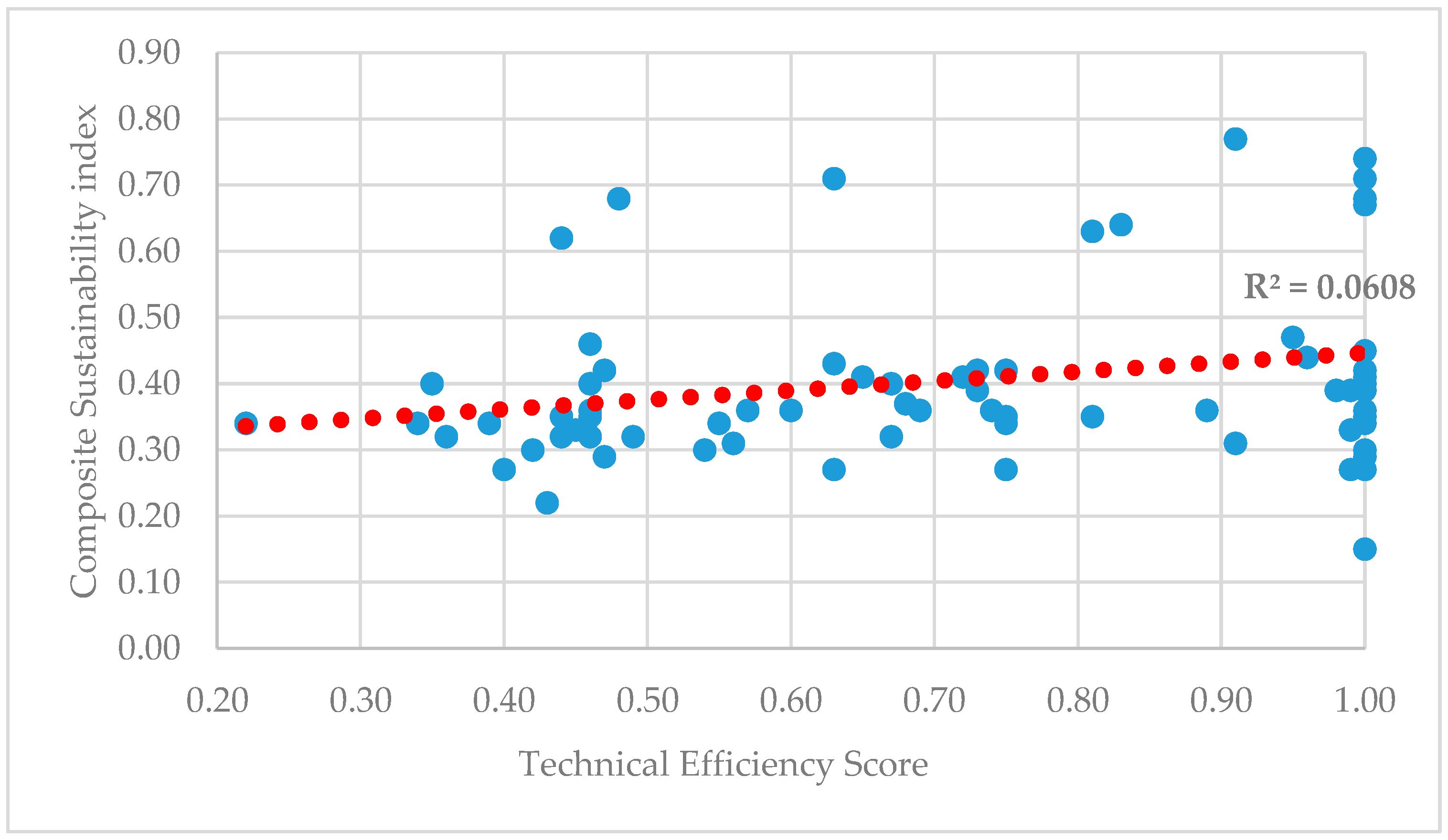 The calculated coefficient of determination (R2 ≈ 0.06) indicated that variations in technical efficiency accounted for only a very small proportion of the variation in sustainability performance. This simple linear regression was presented for descriptive and exploratory purposes to visualize the pattern of association between the two variables.