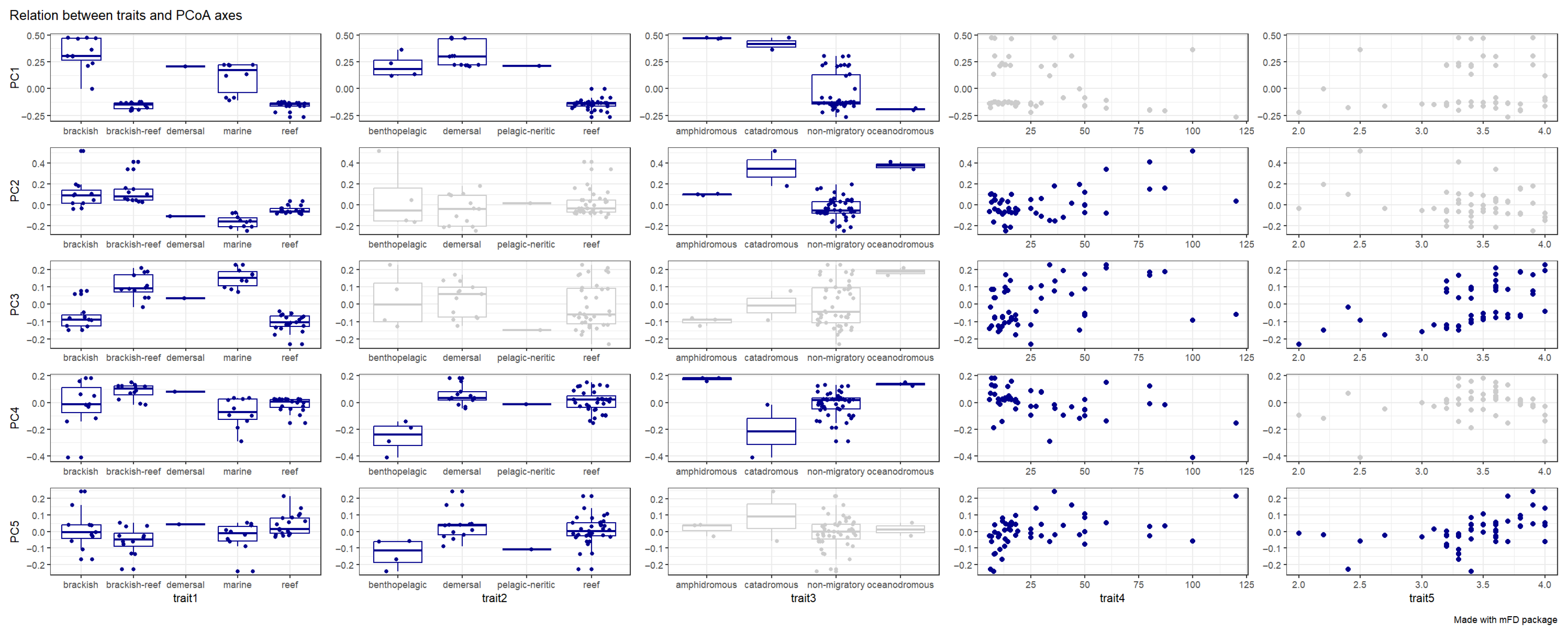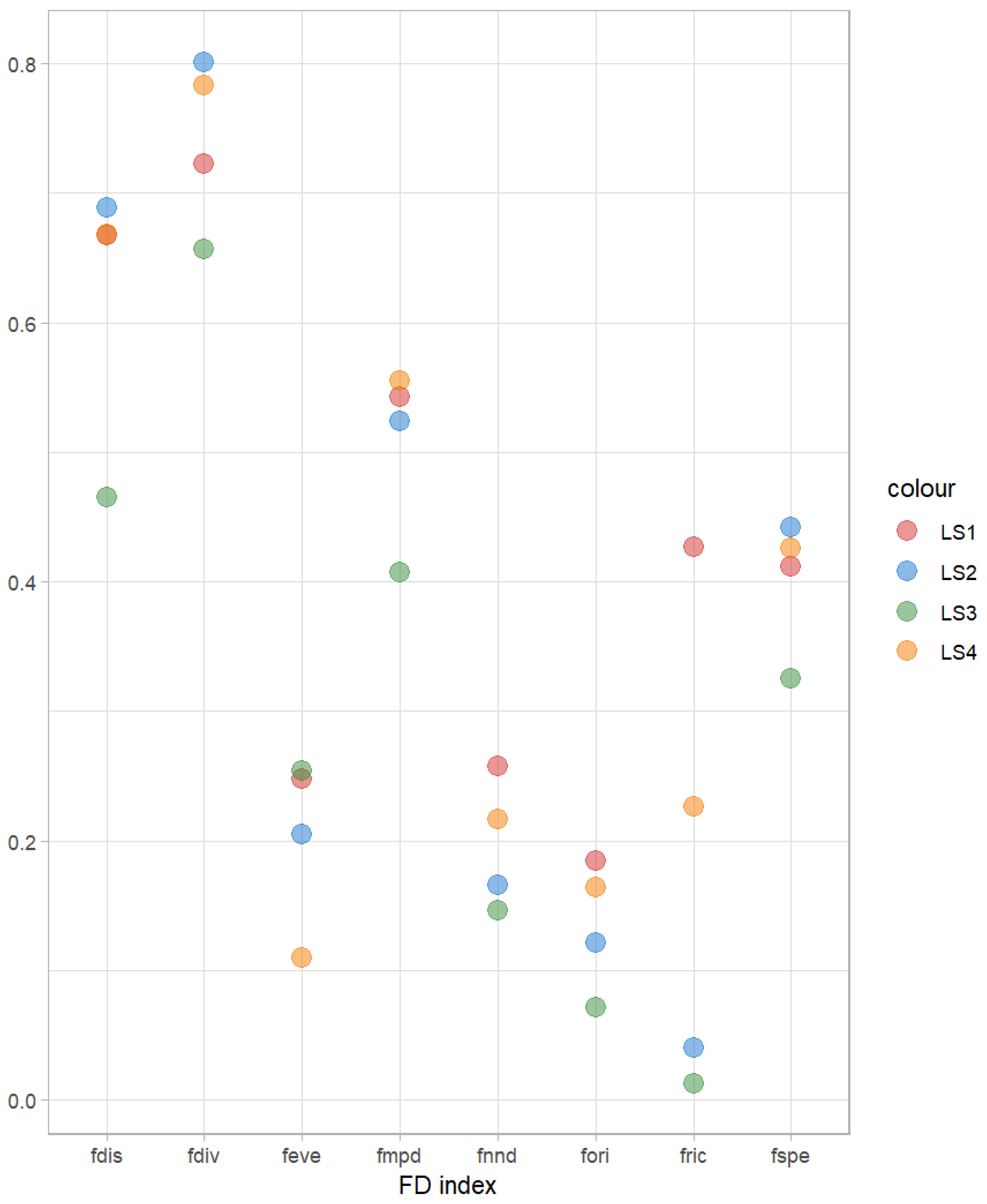 - Magneville, C.; Loiseau, N.; Albouy, C.; Casajus, N.; Claverie, T.; Escalas, A.; Leprieur, F.; Maire, E.; Mouillot, D.; Villéger, S. mFD: An R package to compute and illustrate the multiple facets of functional diversity. Ecography 2022, 1, e05904. [Google Scholar] [CrossRef]