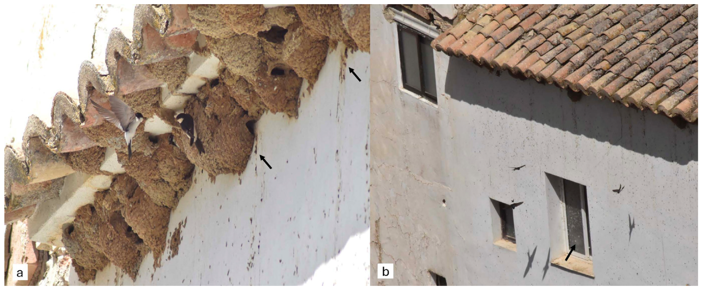 - Pajuelo, L.; De Lope, F.; Da Silva, E. Biología de la reproducción del avión común (Delichon urbica) en Badajoz, España. Ardeola 1992, 39, 15–23. [Google Scholar]