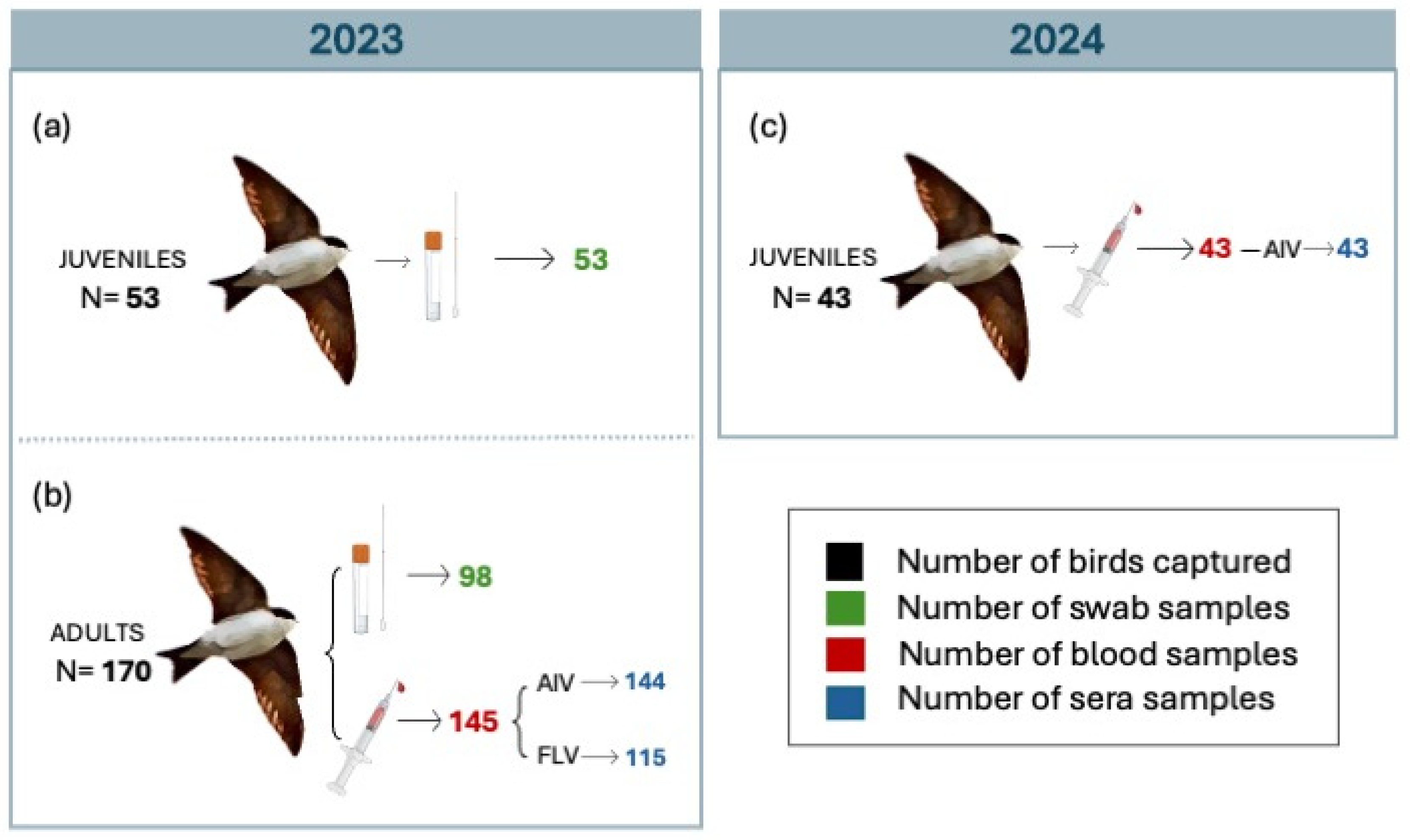 - Provencher, J.F.; Brown, M.G.C.; Hargan, K.; Lang, A.S.; Lapen, D.; Lewis, H.; Mallory, M.L.; Michelin, R.; Mitchell, G.W.; Rahman, I.; et al. Pathogen Surveillance in Swallows (family Hirundinidae): Investigation into Role as Avian Influenza Vector in Eastern Canada Agricultural Landscapes. J. Wildl. Dis. 2024, 60, 763–768. [Google Scholar] [CrossRef]