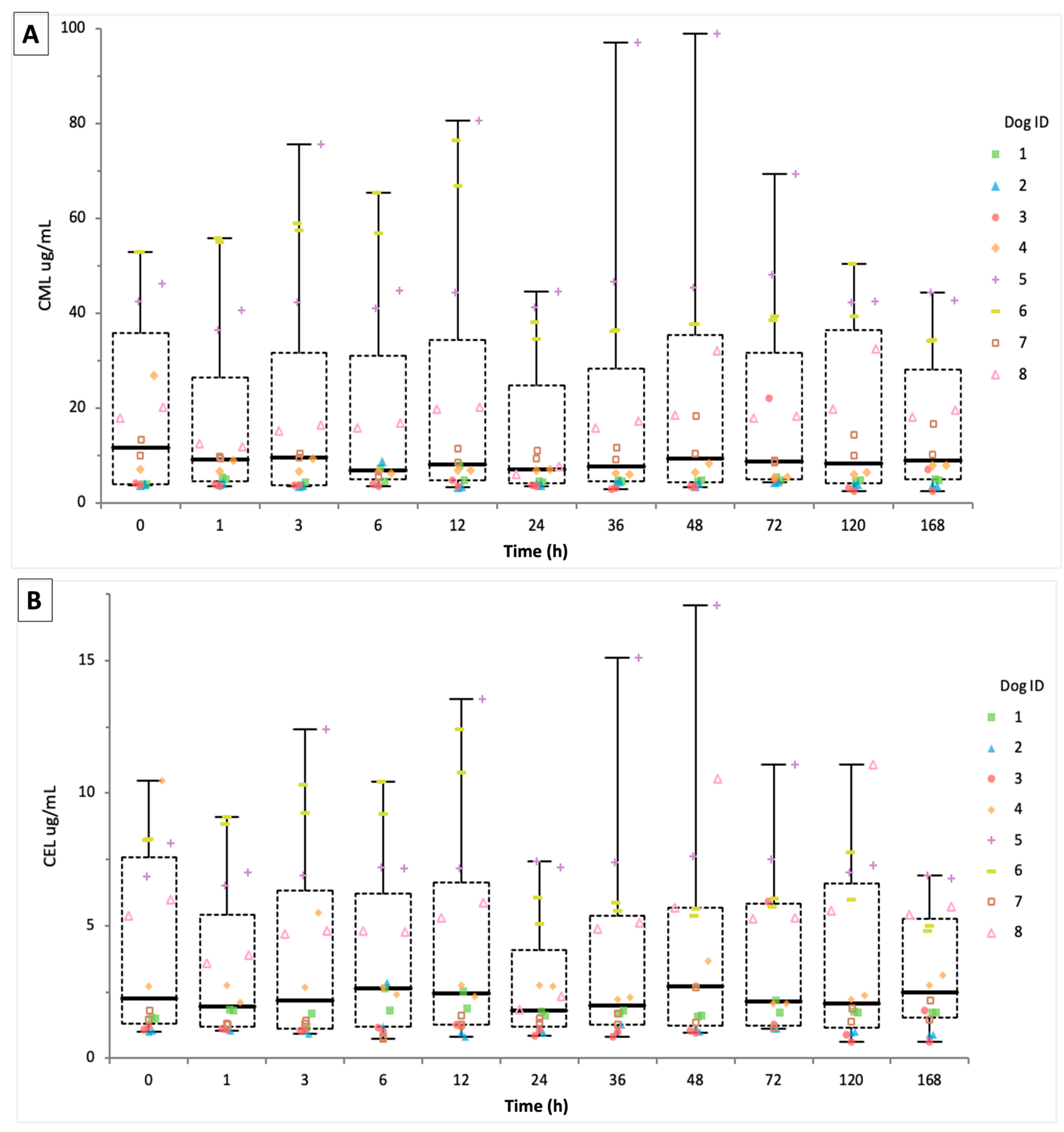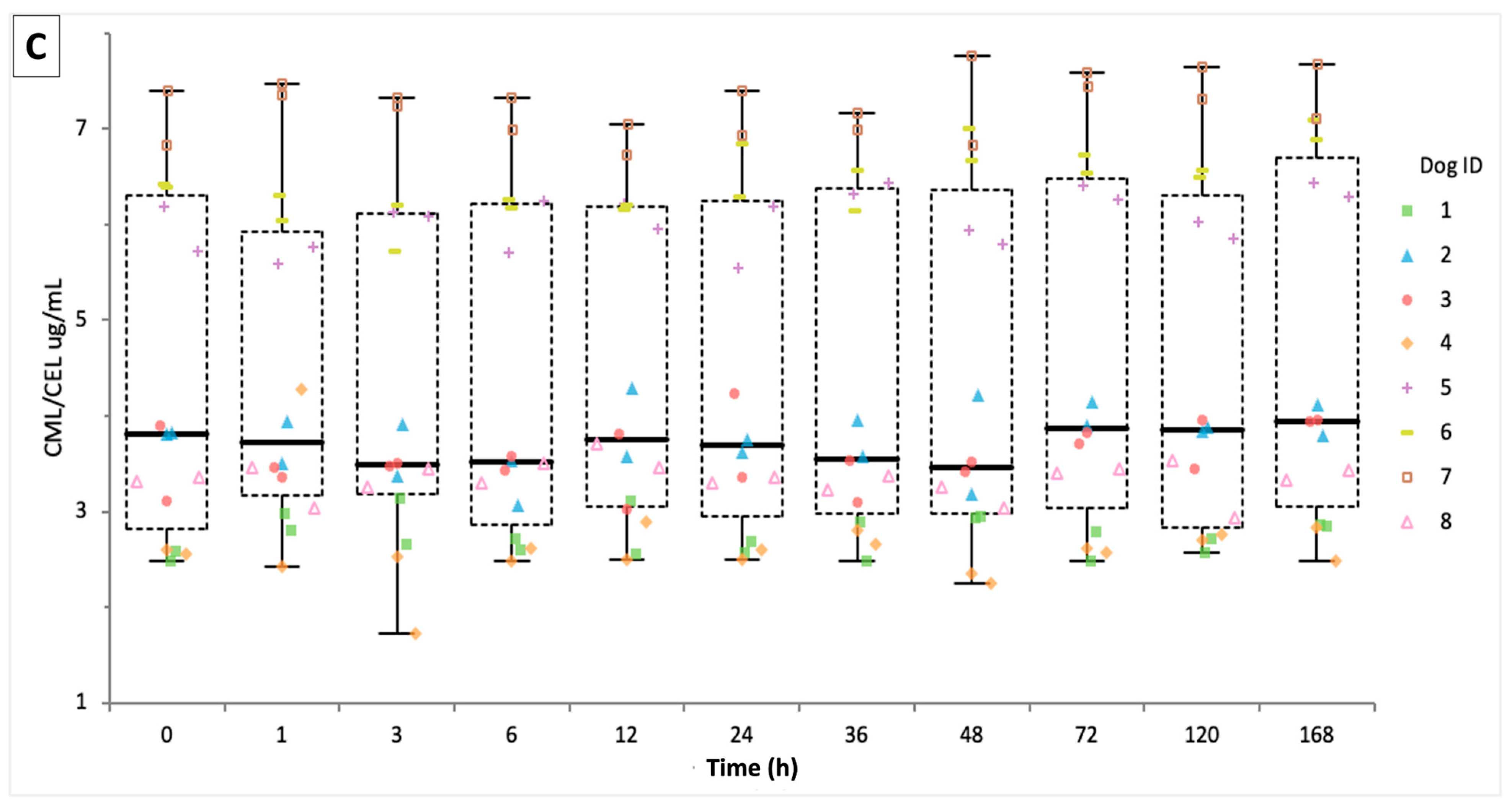 This study evaluates the short-term stability of CML, CEL, and the CML/CEL ratio in canine urine under routine handling conditions, with samples held at 20 °C for up to 168 h before −80 °C storage. This time frame reflects realistic delays that commonly occur between sample collection and analysis, particularly in field-based studies or when samples are shipped to centralized laboratories or biobanks. We hypothesized that concentrations of CML, CEL, and the CML/CEL ratio would exhibit minimal change during storage at 20 °C prior to −80 °C freezing.