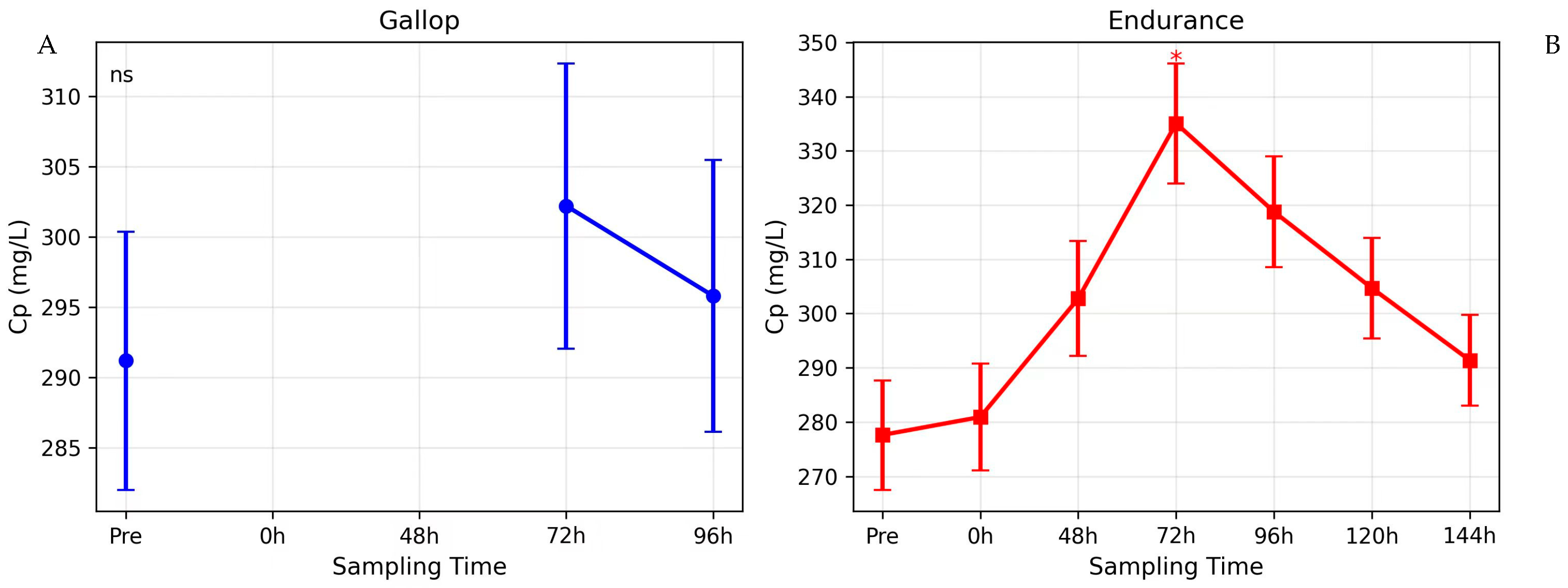 | Cp (mg/L) | Pre | 286.8 ± 30.5 a | 272.5 ± 33.1 a | 0.034 |