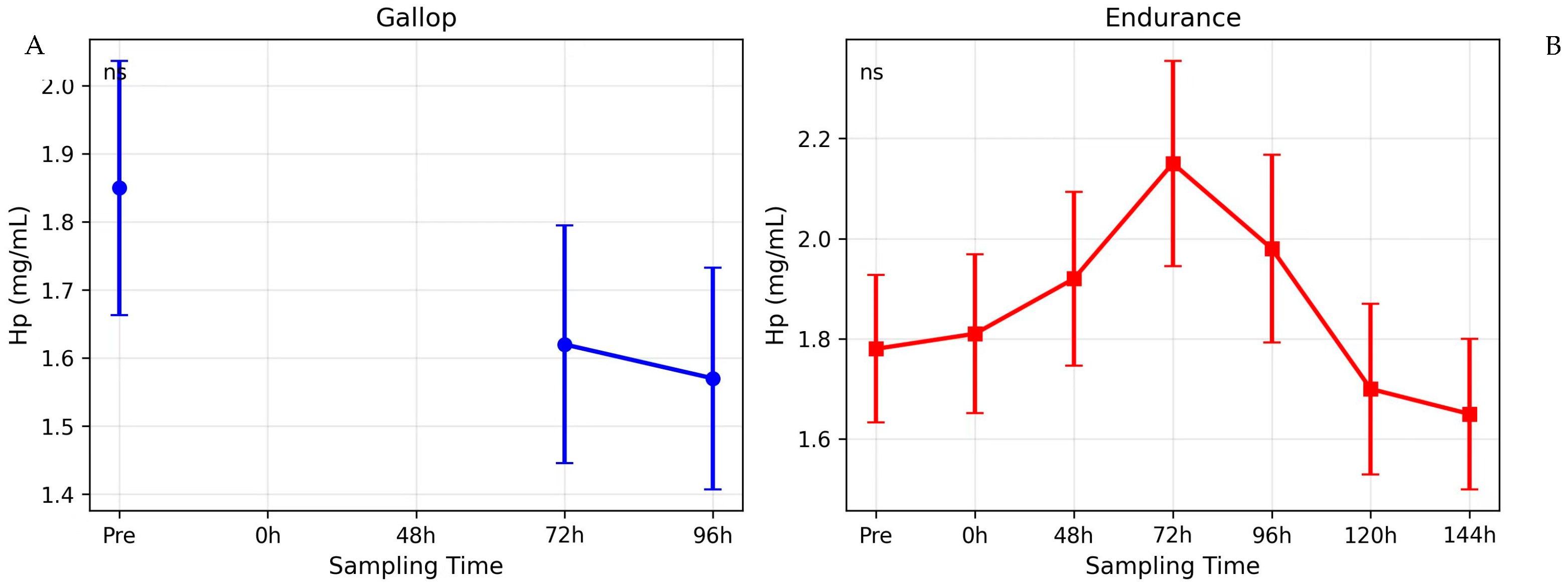 | Hp (mg/mL) | Pre | 1.81 ± 0.60 a | 1.78 ± 0.49 a | 0.558 |