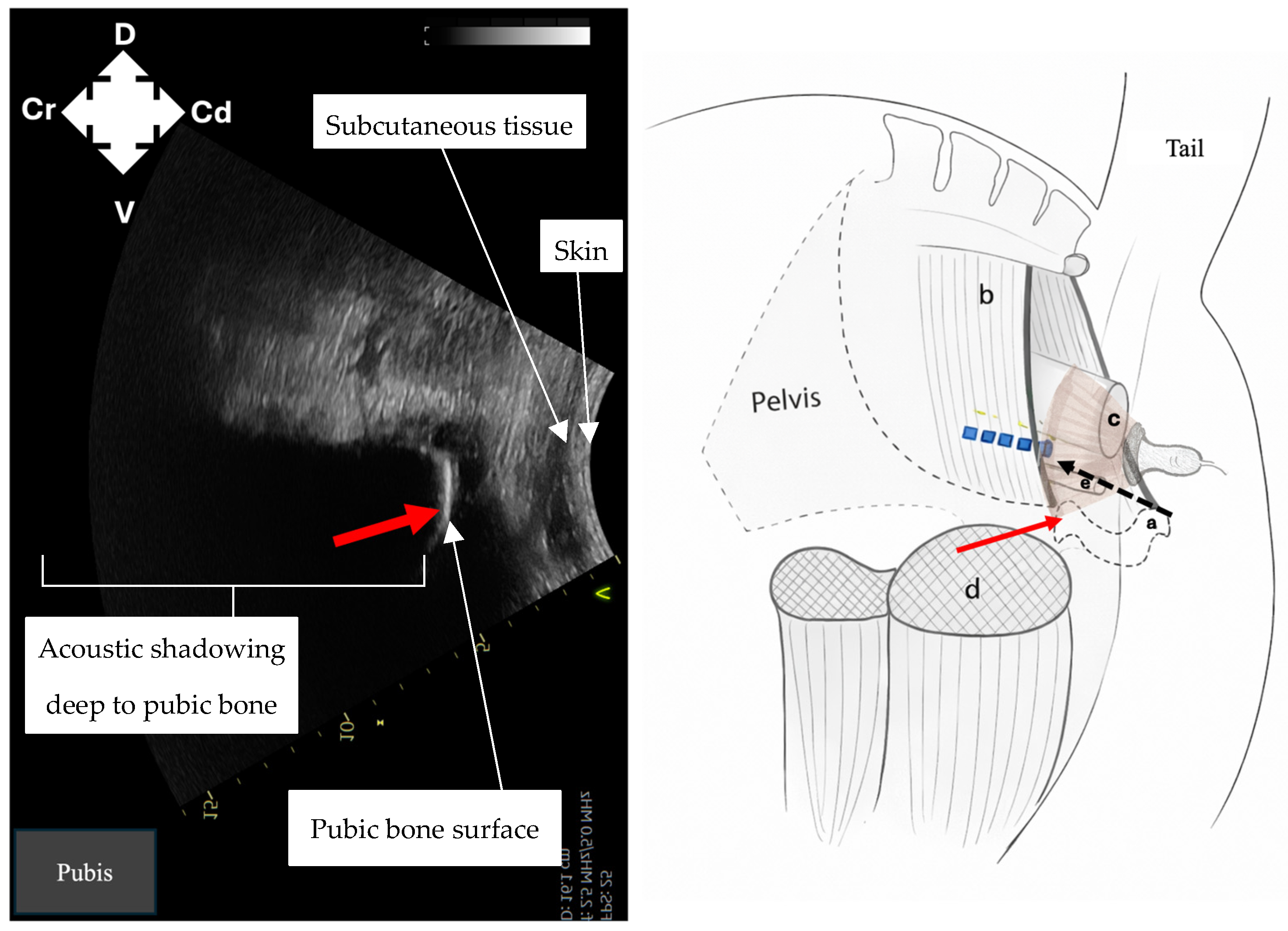 Before injection, cadavers were positioned in dorsal or lateral recumbency depending on the location of euthanasia and the ability to alter the cadaver position. The perineal skin was cleared of gross debris and long hair was clipped. The final skin preparation was performed with alcohol. Ultrasound gel was applied to the skin and to the ultrasound probe.