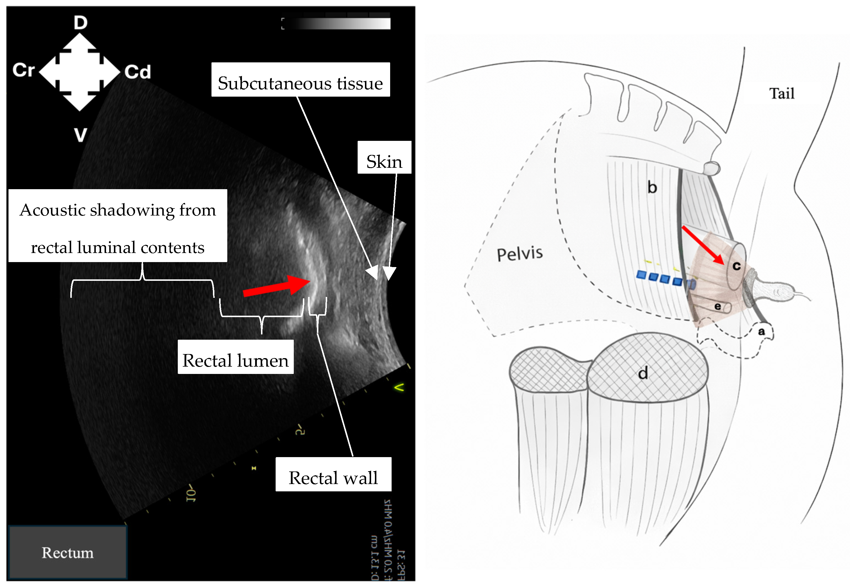 Figure 1) was identified first as a hyperechoic structure, with acoustic shadowing deep to it. Following this, dorsomedial redirection of the probe identified the rectum (