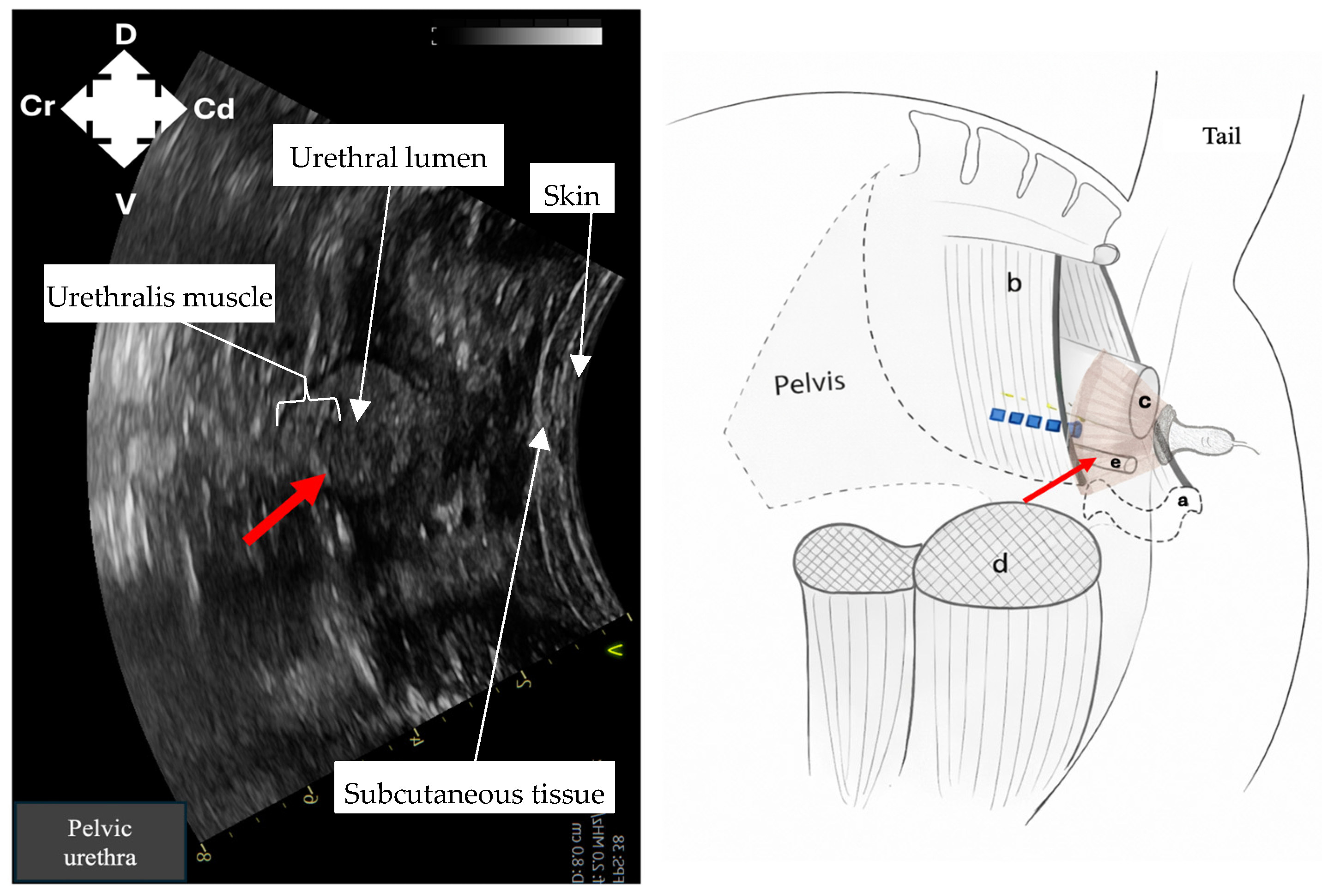 The second fresh cadaver, positioned in dorsal recumbency, was imaged using the technique described in the materials and methods which improved image quality compared to the laterally recumbent cadaver. Identification of the pelvic urethra, rectum, pelvic brim and semimembranosus musculature was possible. The pudendal nerve was not visible. The lower BCS (5/9) of the second cadaver with regular perineal conformation also facilitated imaging.