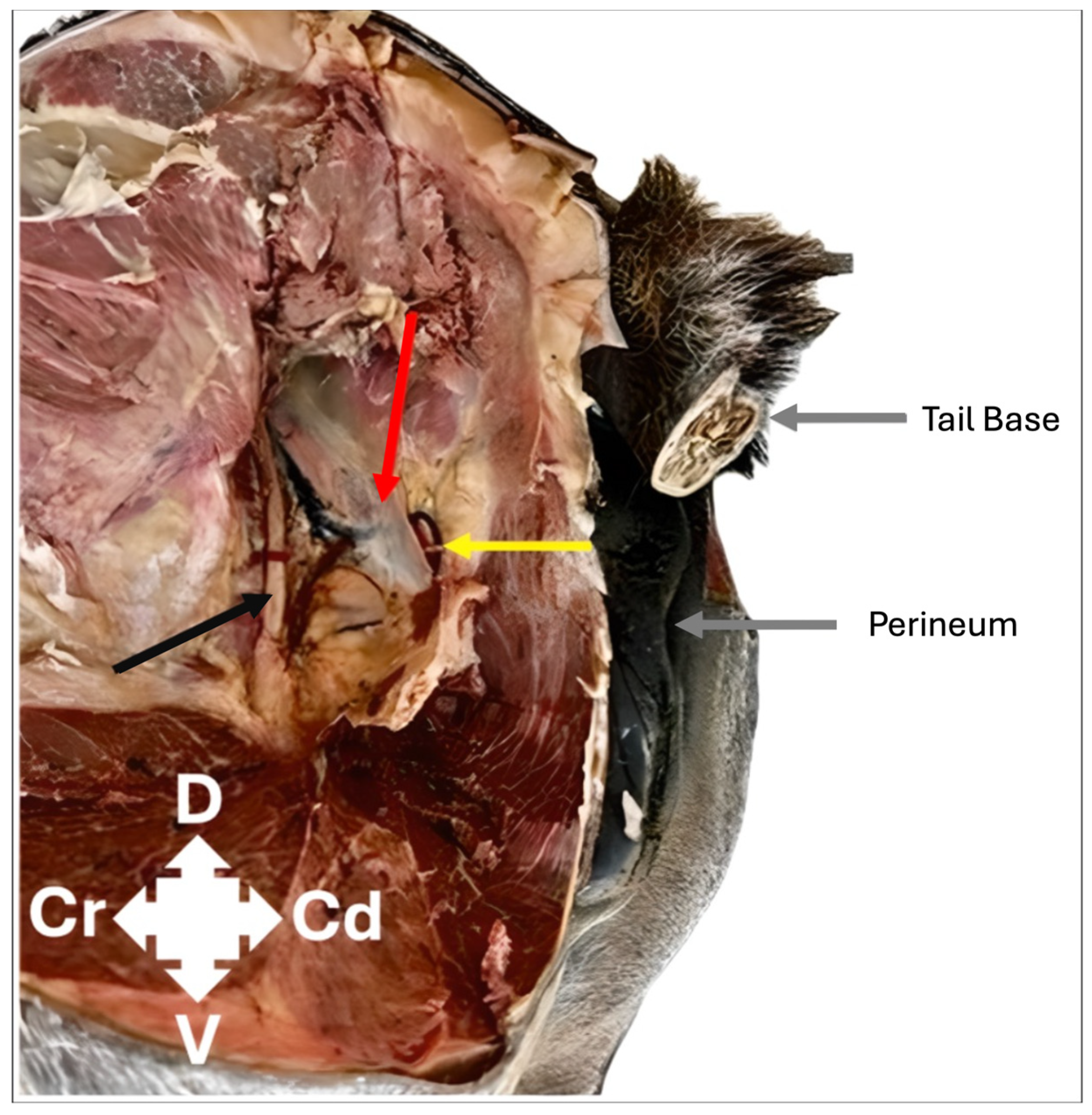 Finally, a fixed equine cadaver specimen was dissected to identify the pudendal nerve and refine the dissection technique. A caudolateral dissection approach identified the sacrosciatic ligament separating the pudendal nerve (on the medial aspect) and the sciatic nerve (on the lateral aspect) (