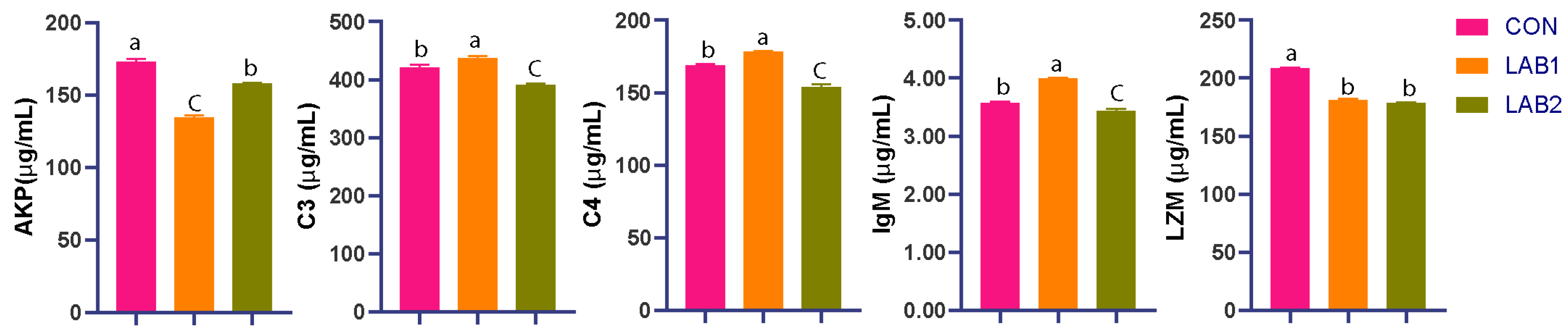 52]. In the present study, serum IgM, C3, and C4 showed a non-linear pattern, increasing in LAB1 and decreasing in LAB2. This pattern indicates that circulating humoral immune factors responded differently at the two inclusion levels. The higher values in LAB1 may reflect stimulation of selected serum immune components, whereas the decline in LAB2 may reflect attenuation or regulatory feedback rather than clear immune enhancement. Because no pathogen challenge or functional immune assay was performed, the lower serum values at the higher dose should not be interpreted either as definitive immunosuppression or as improved immune status [