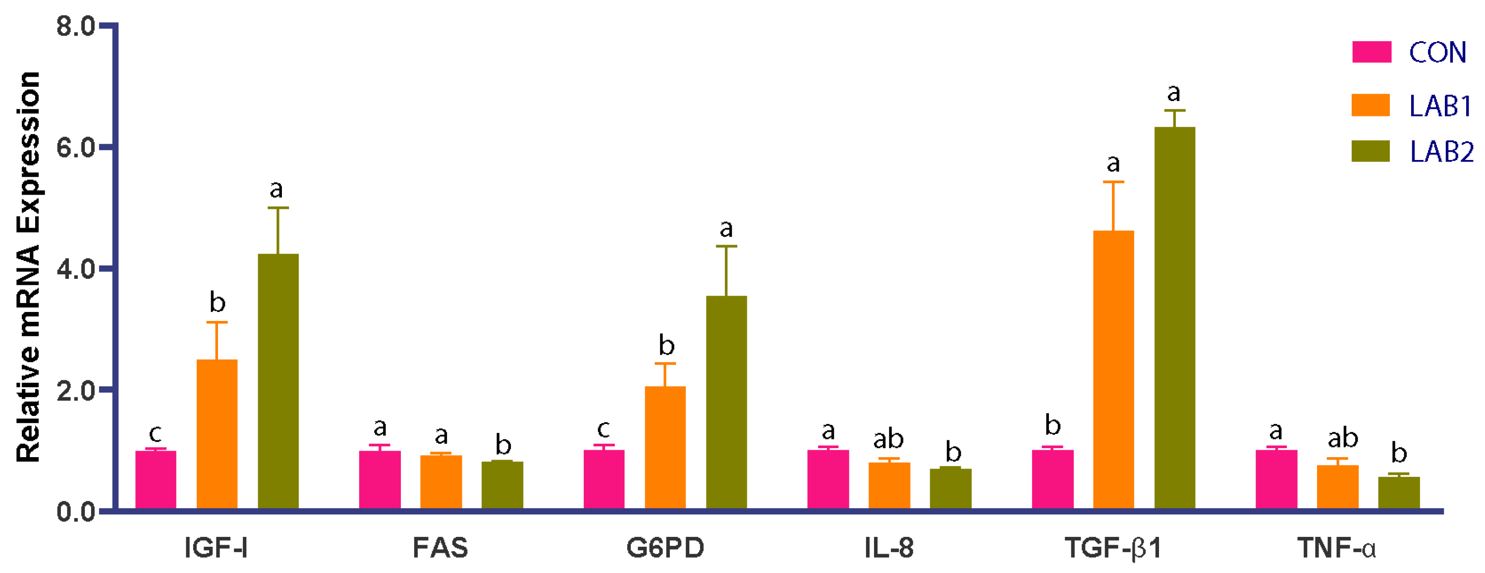 Consistent with the observed growth enhancement, hepatic expression of the growth-regulating gene IGF-1 was significantly upregulated in LAB-supplemented fish, suggesting that LAB inclusion was associated with a physiological state supporting anabolic growth. Similar growth-promoting effects have been reported for other LAB strains; for example, supplementation of