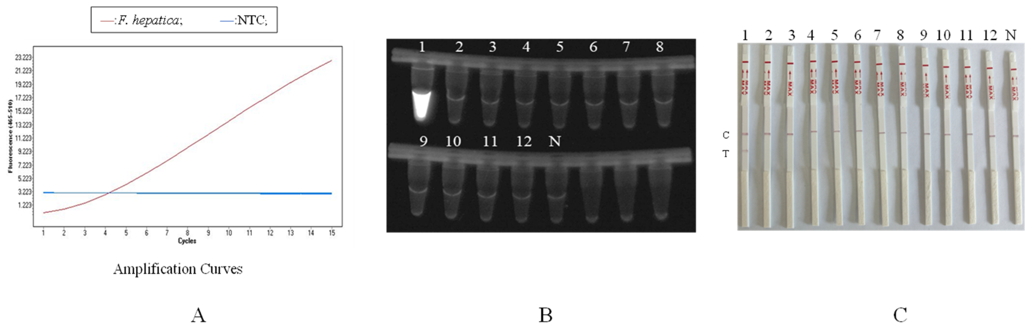 - Yang, Q.; Liu, J.; Yu, Y.; Cao, Y.; Liu, C.; Su, H.; Huang, T.; Liu, S.; Yuan, J.; Zhao, Z.; et al. Rapid and multiple visual detection of Fasciola hepatica in feces via recombinase polymerase amplification integrated with CRISPR/Cas12a technology. Int. J. Biol. Macromol. 2024, 282, 136912. [Google Scholar] [CrossRef] [PubMed]