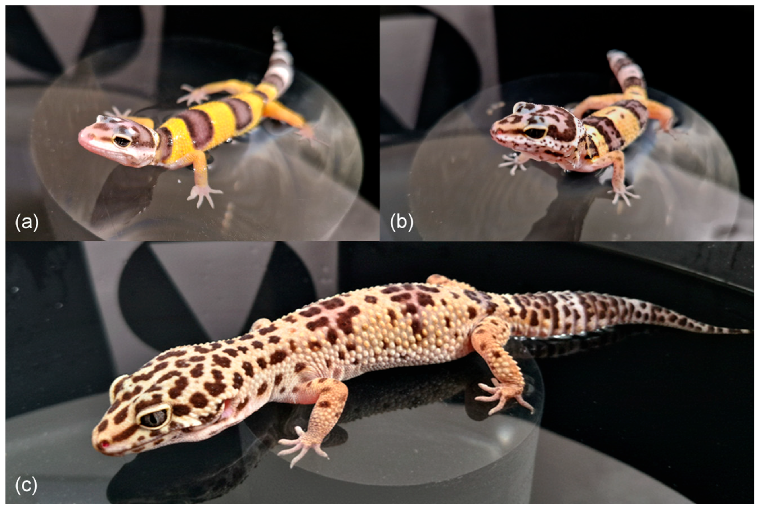 - Frynta, D.; Jančúchová-Lásková, J.; Frýdlová, P.; Landová, E. A comparative study of growth: Different body weight trajectories in three species of the genus Eublepharis and their hybrids. Sci. Rep. 2018, 8, 2658. [Google Scholar] [CrossRef]