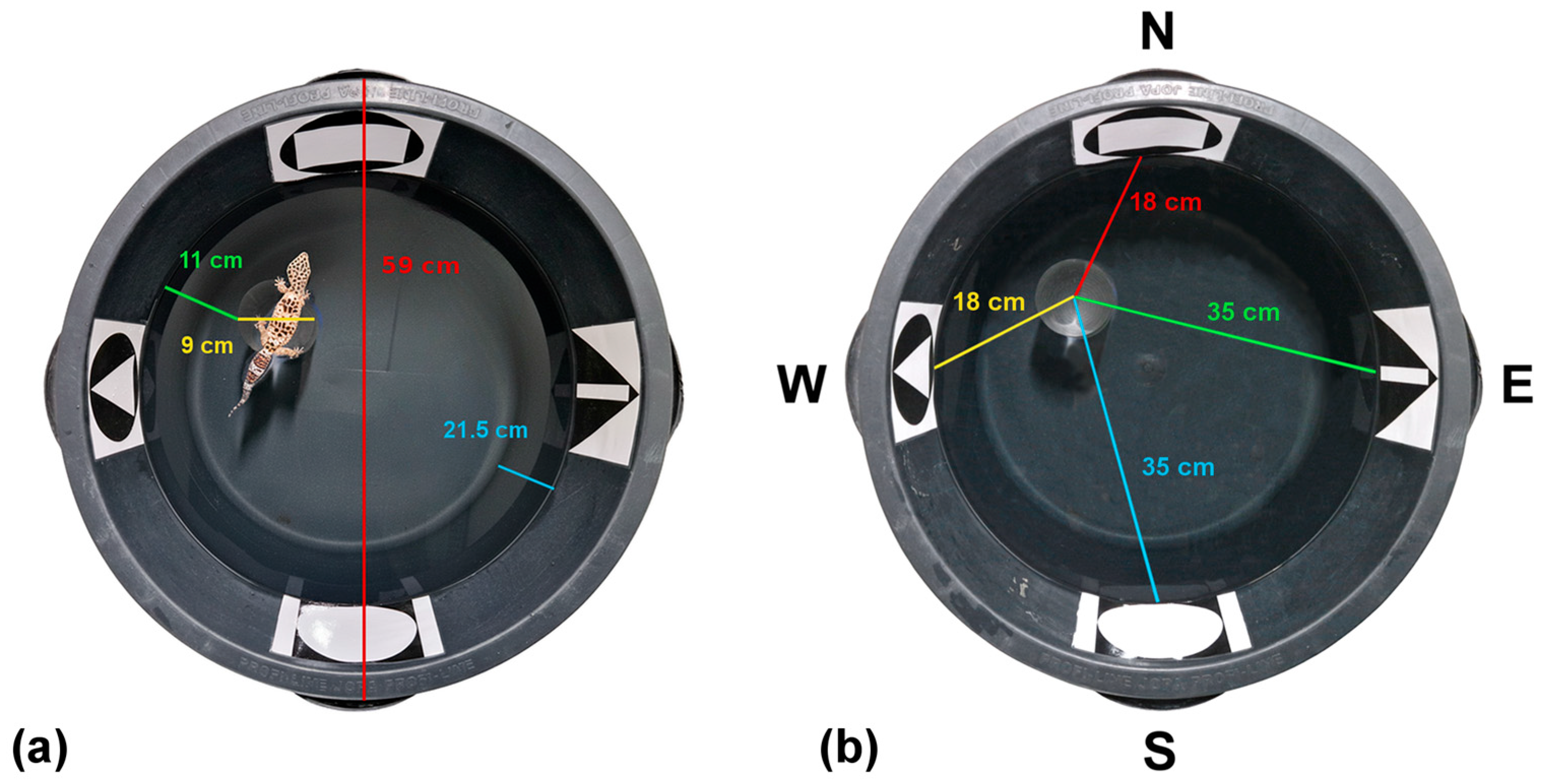 - Landová, E.; Chomik, A.; Vobrubová, B.; Hruška-Hášová, T.; Voňavková, M.; Frynta, D.; Frýdlová, P. Spatial orientation of Eublepharis macularius (Reptilia: Squamata) in a Morris Water Maze task. Acta Soc. Zool. Bohem. 2023, 86, 97–117. [Google Scholar]