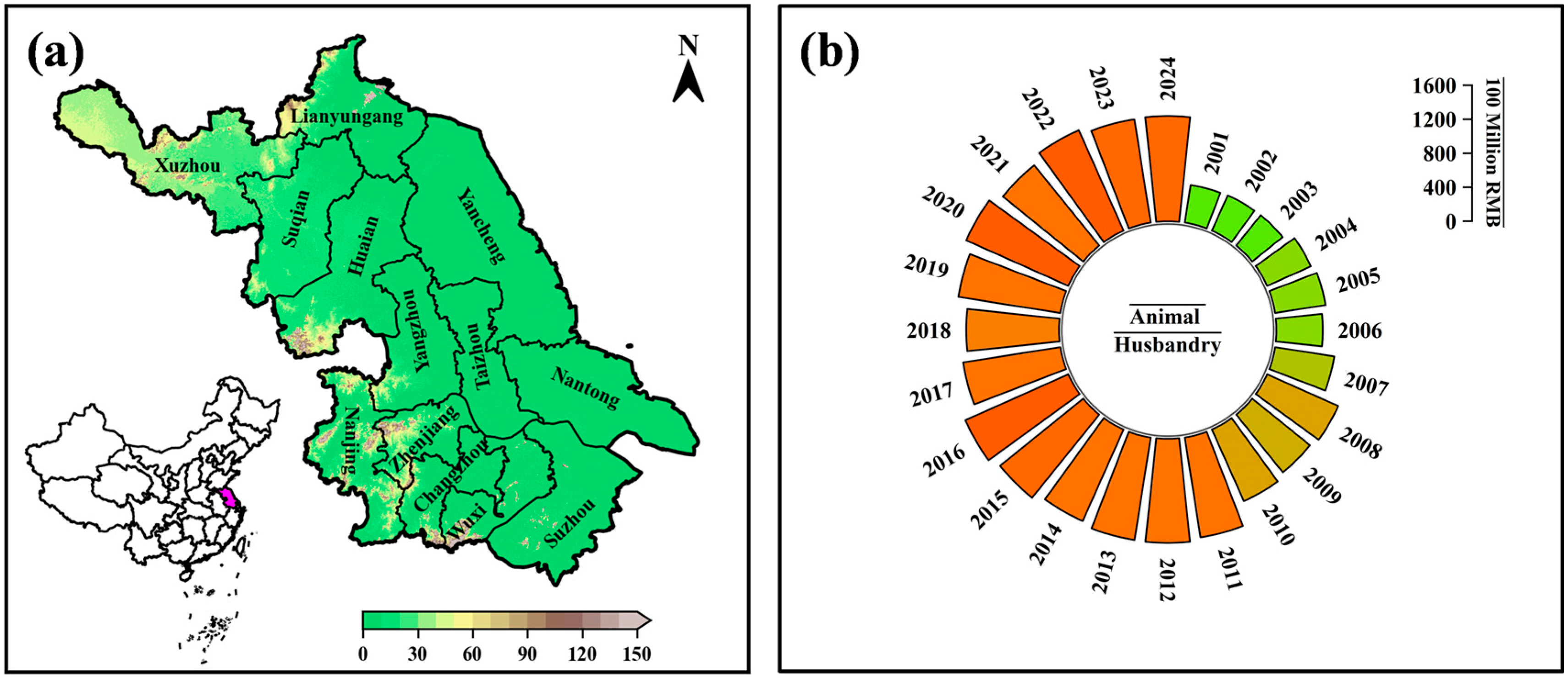- Jiangsu Provincial Bureau of Statistics. Jiangsu Statistical Yearbook; Jiangsu Provincial Bureau of Statistics: Nanjing, China, 2024. [Google Scholar]
