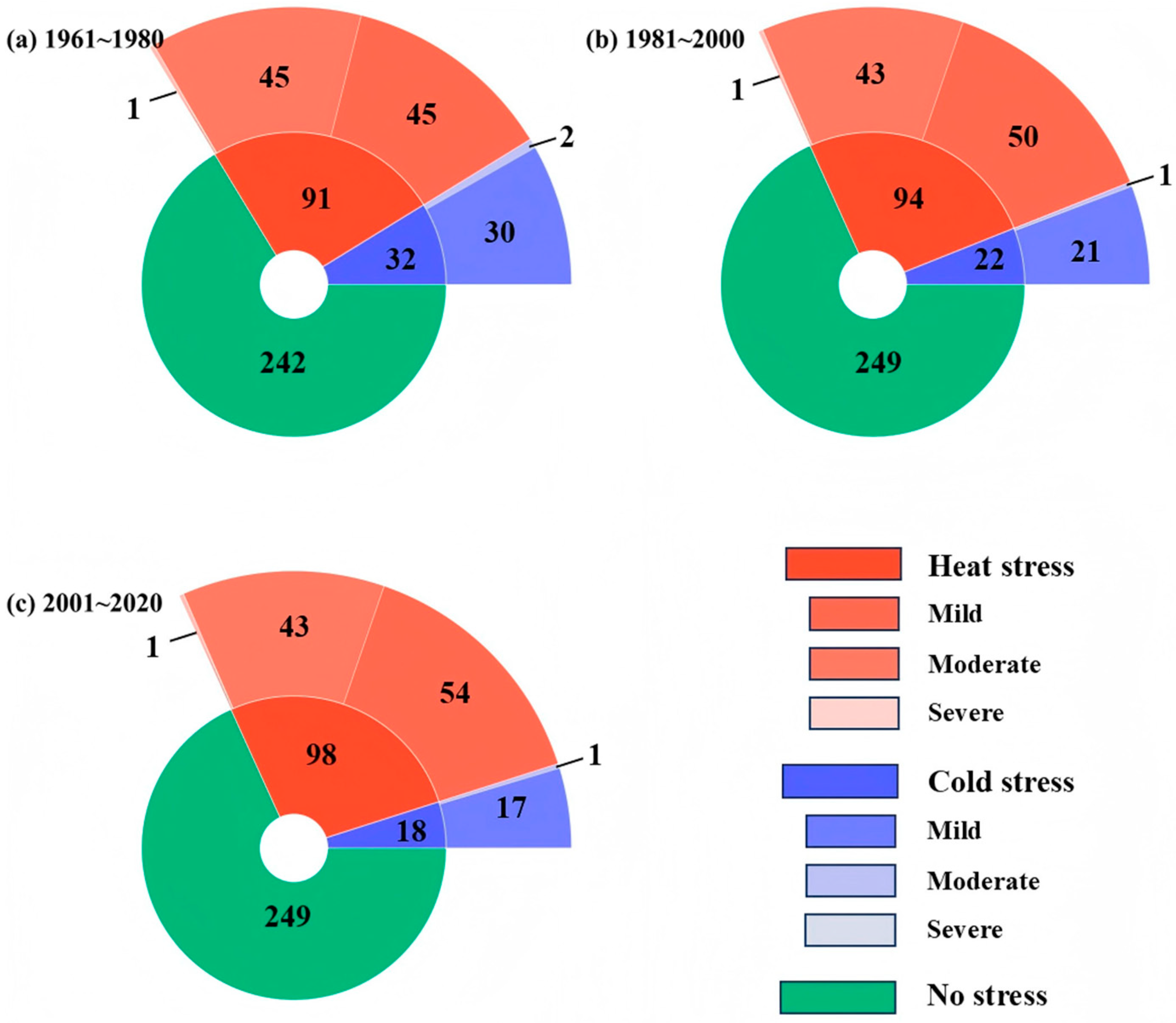 3.2. Spatiotemporal Evolution of Heat- and Cold-Stress Days in Jiangsu
