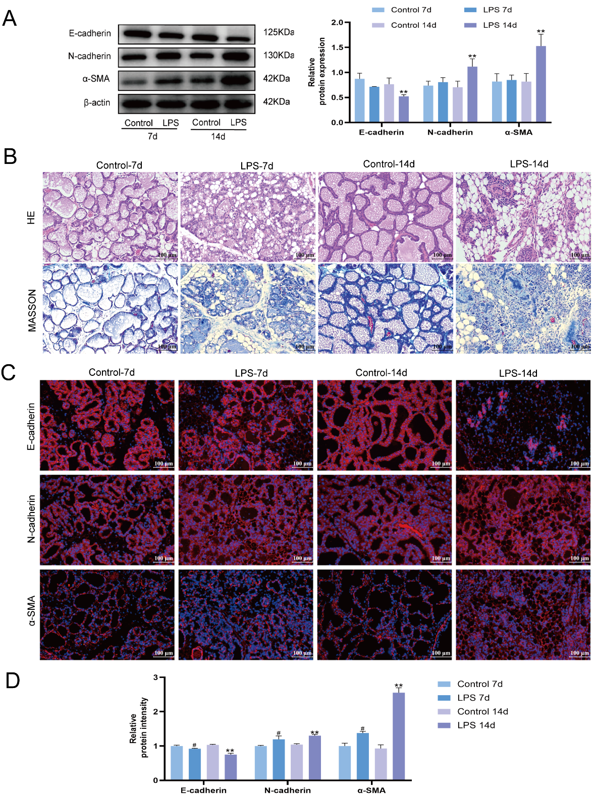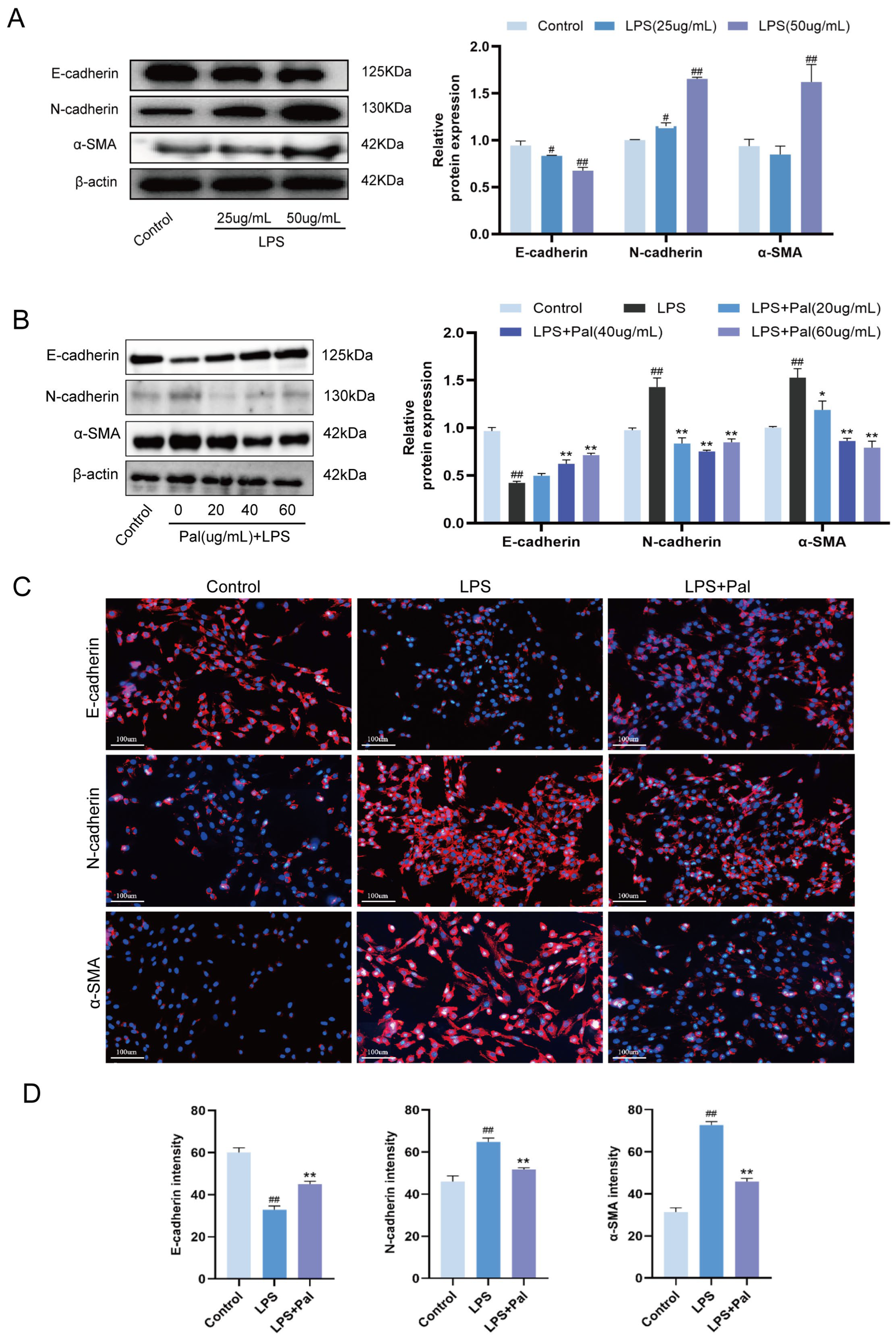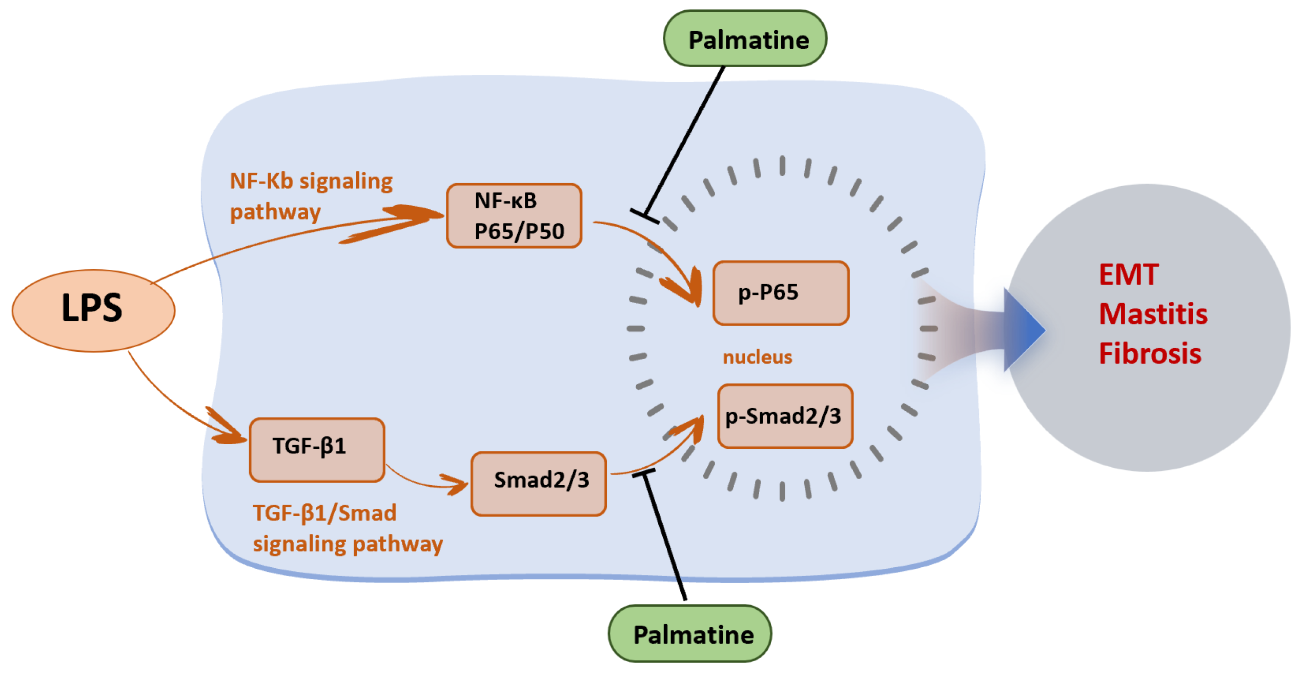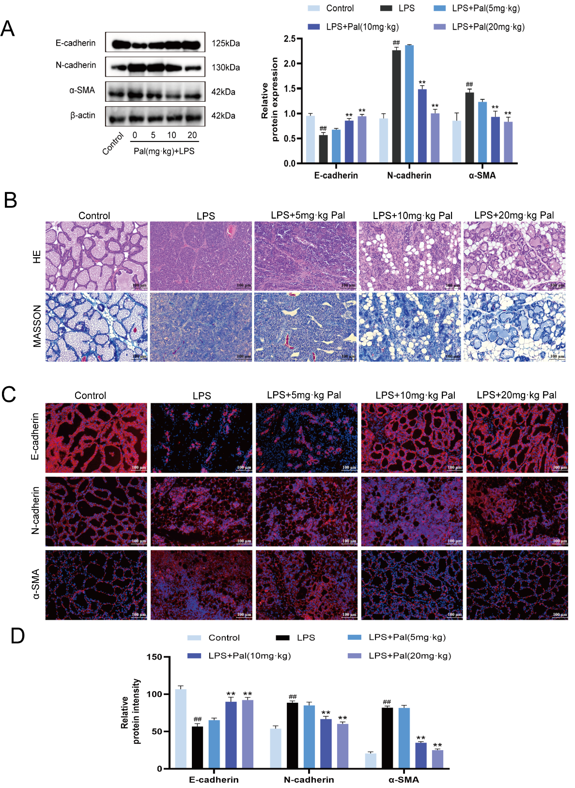 Chicago/Turabian StyleShi, Dongxue, Dan Bao, Peiru Li, Kejiang Liu, Qi Wang, Weitao Dong, Xingxu Zhao, and Yong Zhang. 2026. "Palmatine Attenuates LPS-Induced EMT in MAC-T Cells and Mammary Fibrosis in Mice, with Suppression of NF-κB/TGF-β1/Smad Signaling In Vivo" Animals 16, no. 8: 1187. https://doi.org/10.3390/ani16081187