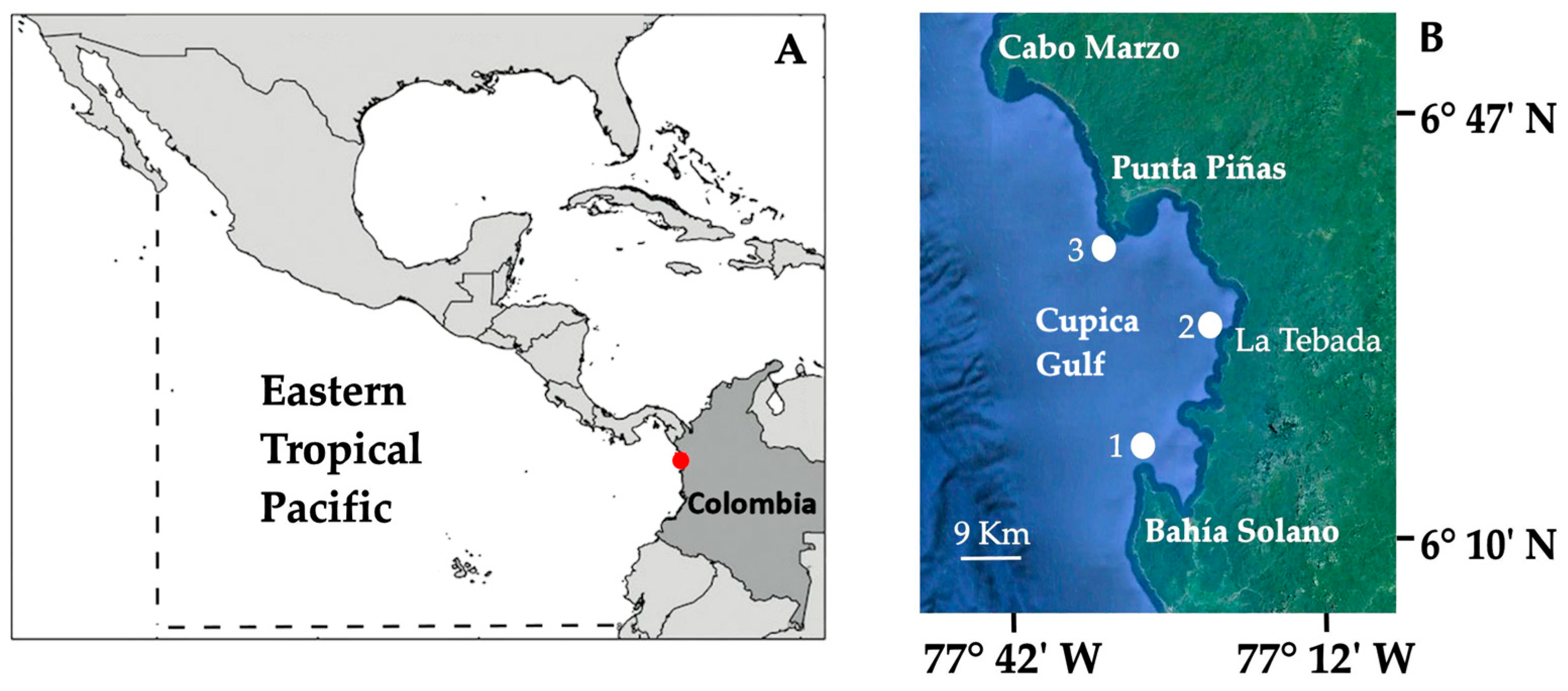 The study was conducted in the northern Colombian Pacific, specifically in the Gulf of Cupica, between Bahía Solano (6°13′38.15″ N; 77°24′15.60″ W) and Punta Piñas (6°39′24.50″ N; 77°31′25.90″ W). This area lies within the Eastern Tropical Pacific, is influenced by the Panama and Colombia Currents, and has been designated as an Exclusive Artisanal Fishing Zone (ZEPA), extending 2.5 nautical miles from Punta Solano to Punta Ardita along the border with Panamá. Three sampling sites were selected within artisanal fishing grounds: Bahía Solano (Site 1), La Tebada (Site 2), and Punta Piñas (Site 3) (