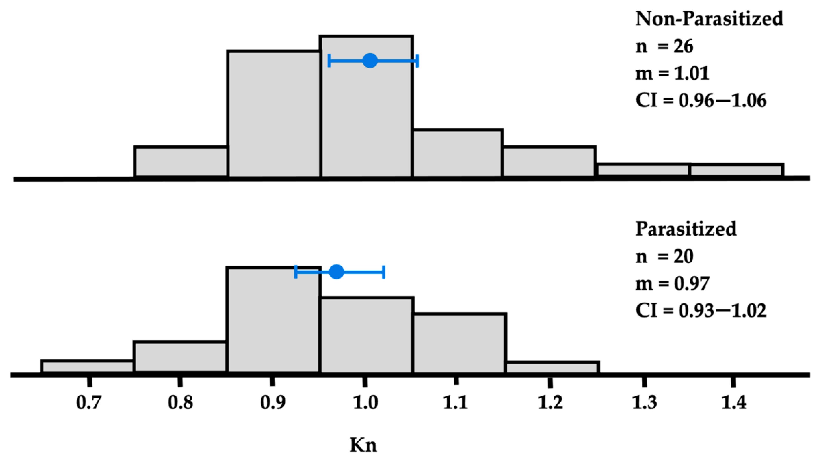 Host condition was evaluated using Fulton’s condition factor, derived from length–weight relationships [
