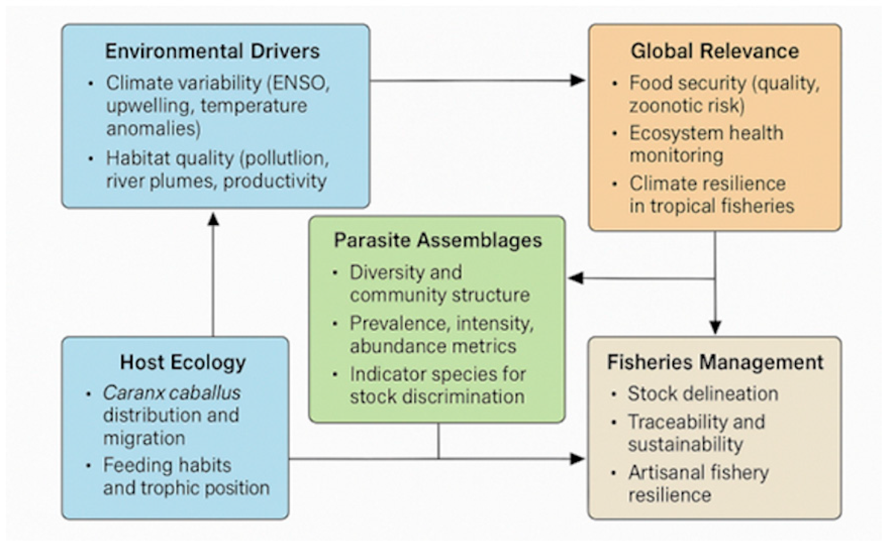 18]. Together, these findings establish a conceptual framework in which parasites serve as bioindicators of both fisheries stock structure and ecosystem resilience, situating local artisanal fisheries within global debates on sustainability and climate-driven variability.