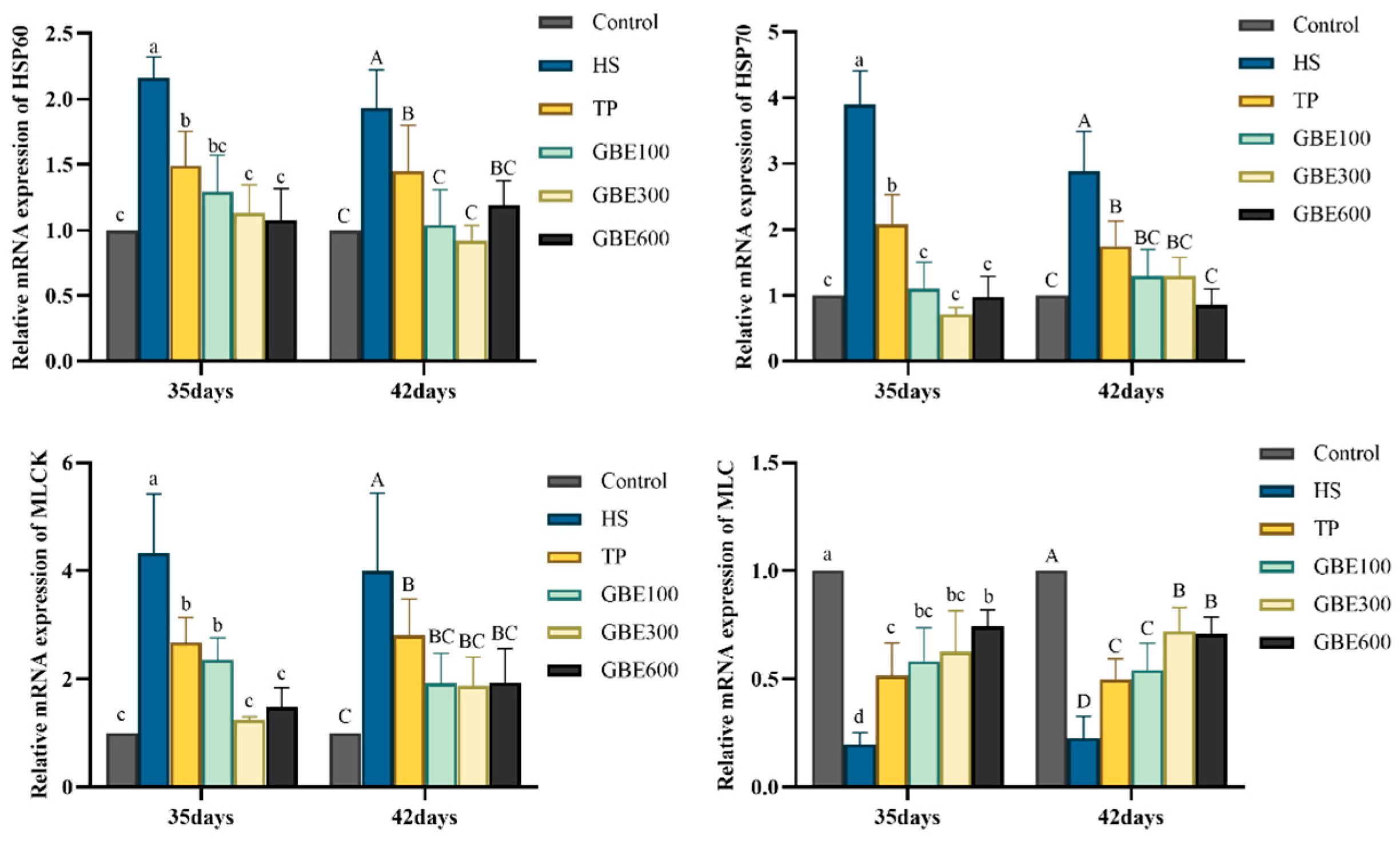 3.4. Effects of Dietary GBE and TP on Heat Shock Proteins and MLCK/MLC Expression in Heat-Stressed Broilers
