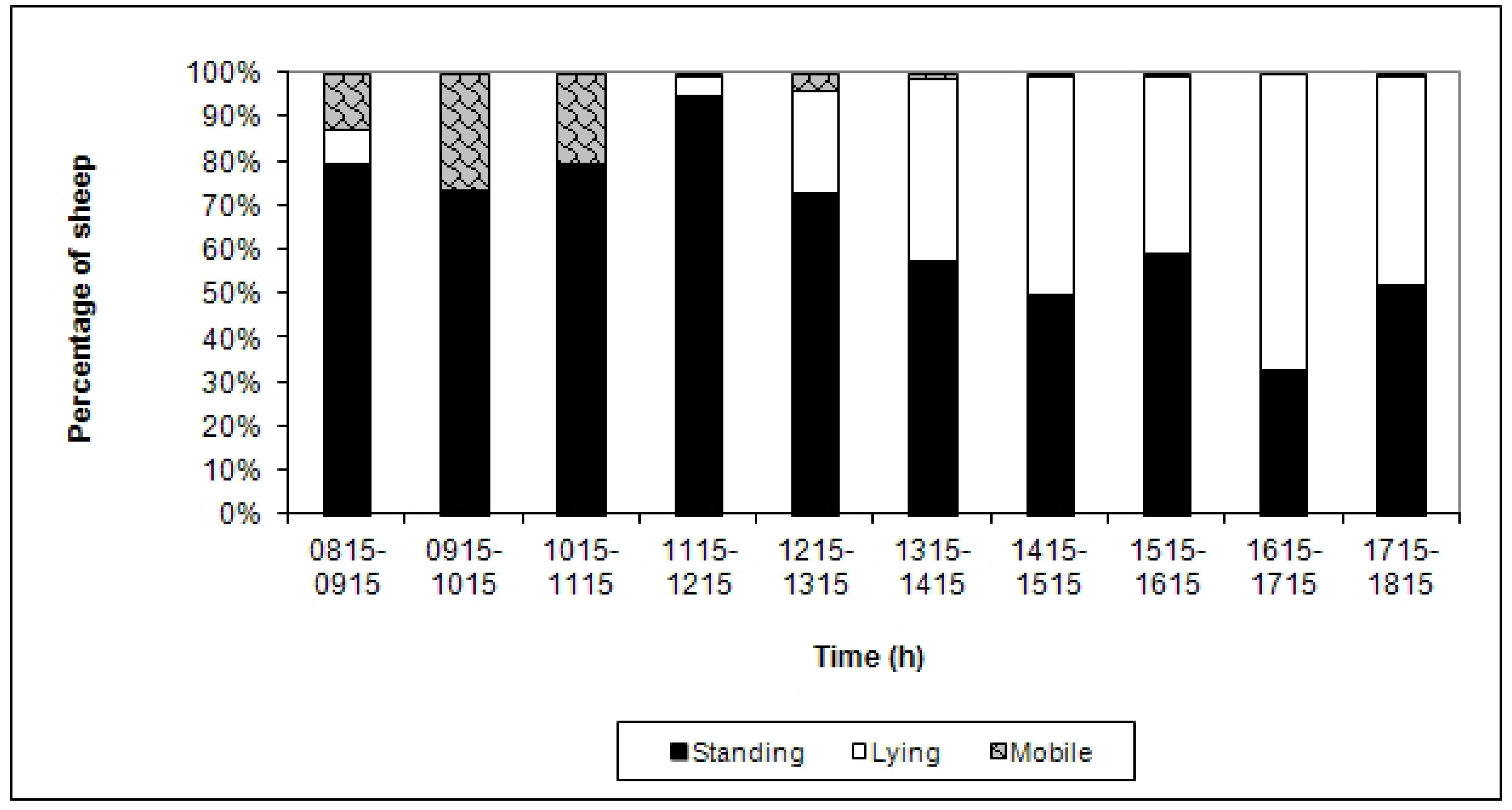The mean percentage of 15-min sample points over the two days in which sheep displayed individual postures and behaviours is shown in Table 2. A high proportion of sheep were standing in the morning (Figure 1), with sheep on average spending 81% of their time standing (Table 2). Thus, the majority of sheep in the present study spent the morning standing or mobile, while the time spent lying was predominant in the afternoon.