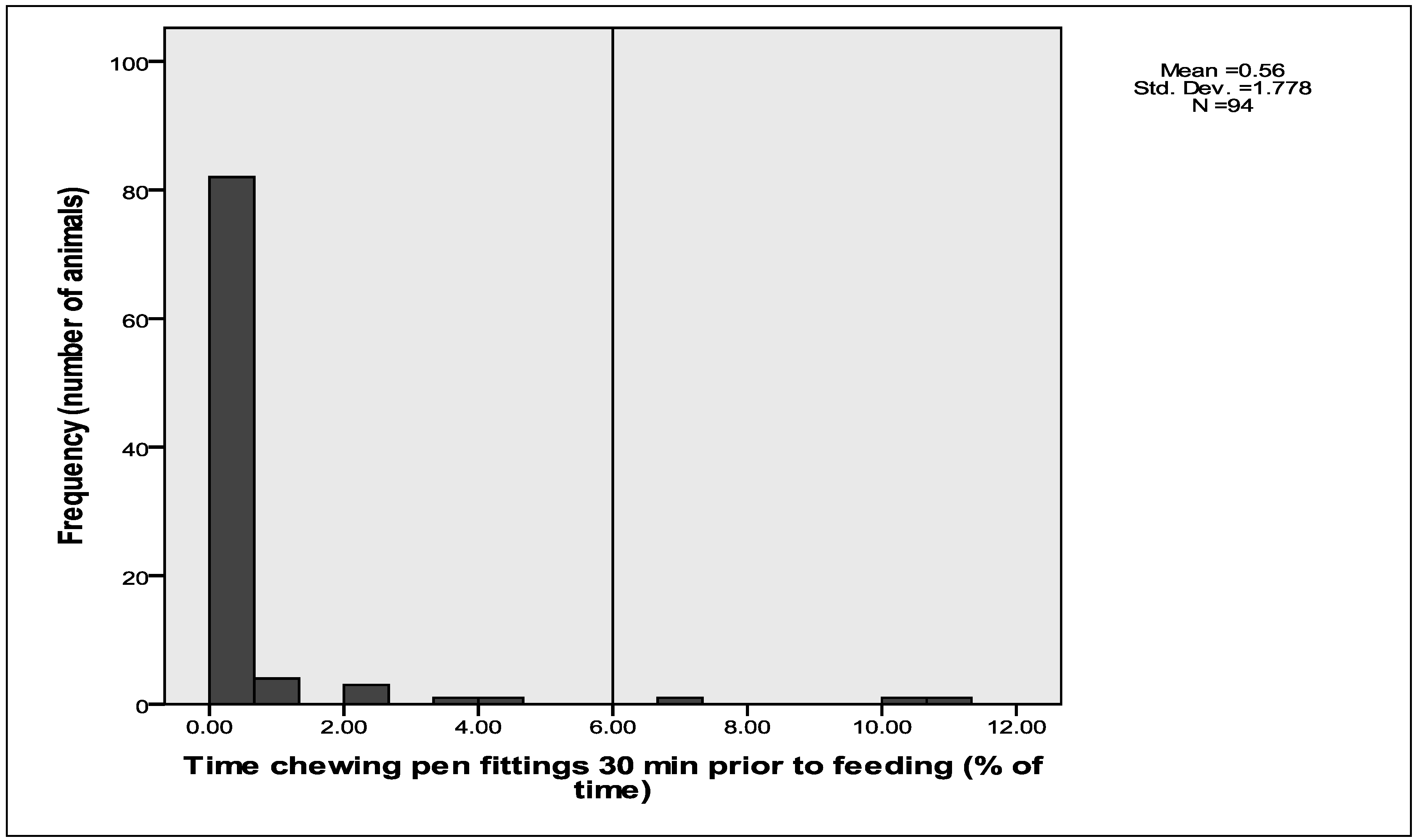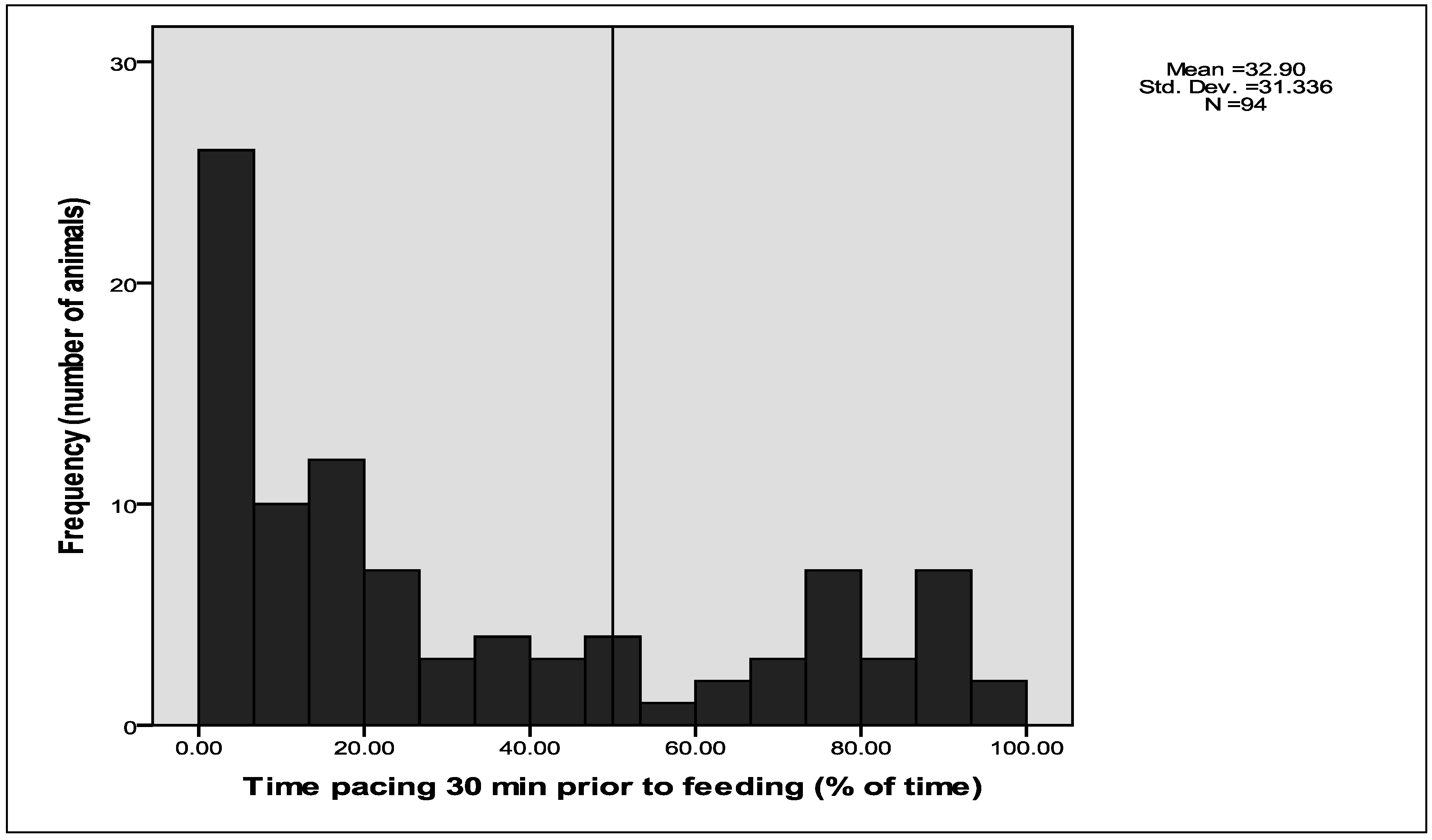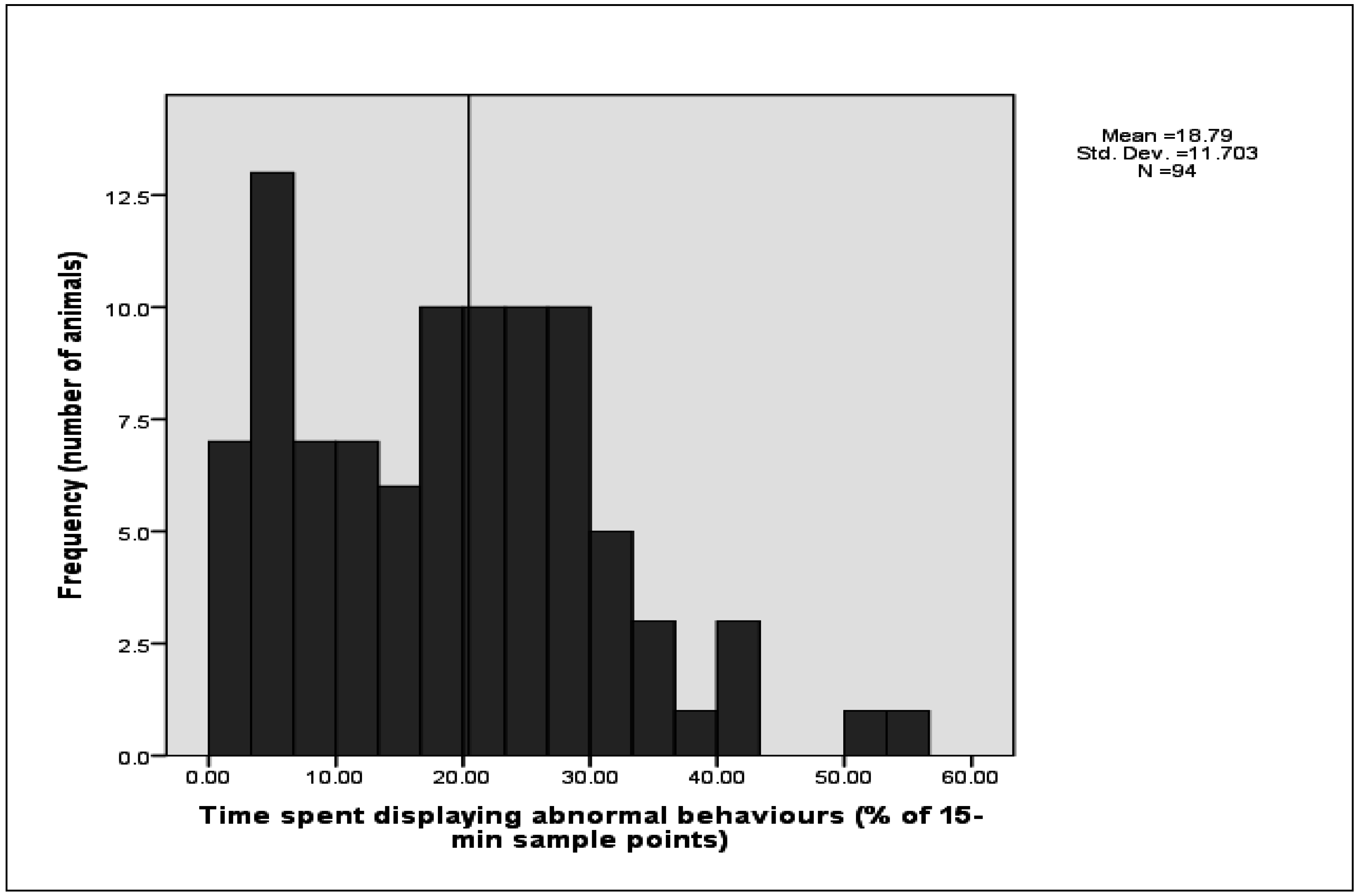For the data in which behaviour was continuously recorded for 30 min prior to feeding, the duration of each behaviour displayed by each animal was calculated. These data are presented as histograms showing the distributions of the percentage of time in the 30 min prior to feeding in which the 94 sheep displayed the behaviours of pacing and interacting with the pen fixtures. Pen type (1.42 m × 0.88 m with feeders attached to the front of the pens and 1.52 m × 0.96 m with feeders located within the pens) was distributed throughout the facility. Univariate General Linear Model (SPSS 16.0) was used to examine the effects of pen design on time spent displaying abnormal behaviours. To reduce skewness of the residuals, prior to the analysis, square root transformation was performed on the variable frequency of abnormal behaviours.