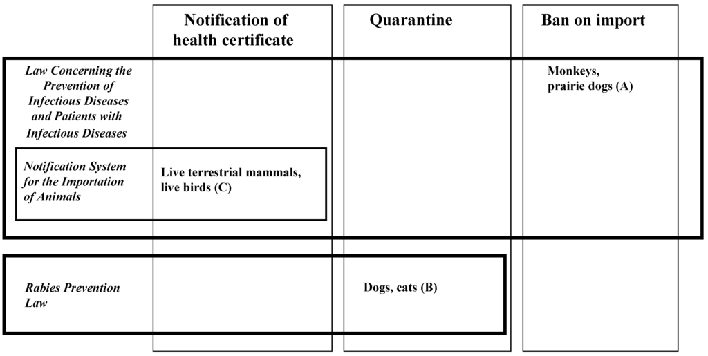 Regulatory framework for the restriction of imports of companion animals into Japan. This figure focuses on possible common household pets as dogs, cats, rodents, and so on. Other than these animals, these laws also cover wild animals and animals used for research or exhibition. Refer to [4] to understand the whole picture of the border zoonosis control in Japan.